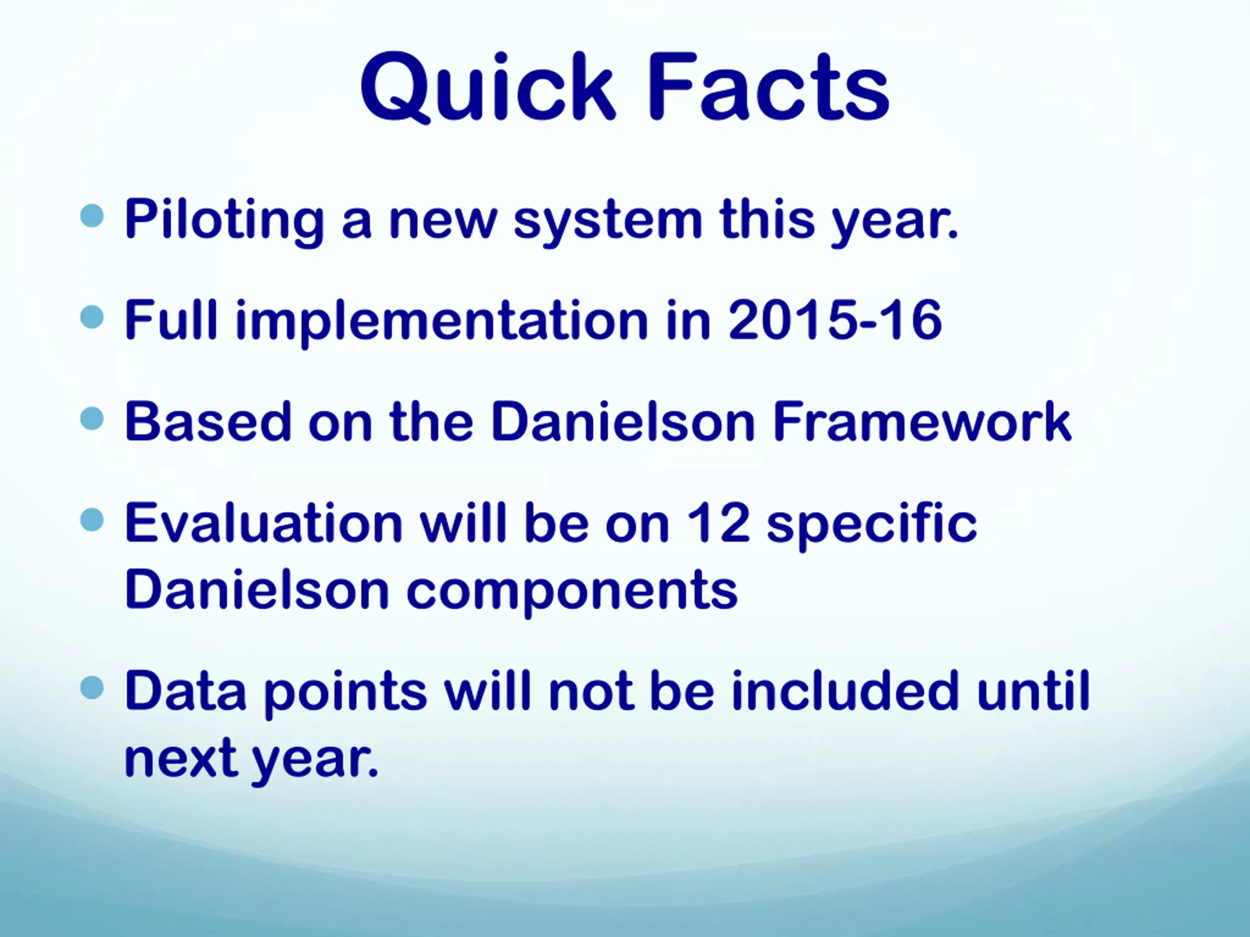 Quick Facts Piloting a new system this year. Full implementation in 2015-16 Based on the Danielson Framework Evaluation will be on 12 specific Danielson components Data points will not be included until next year.