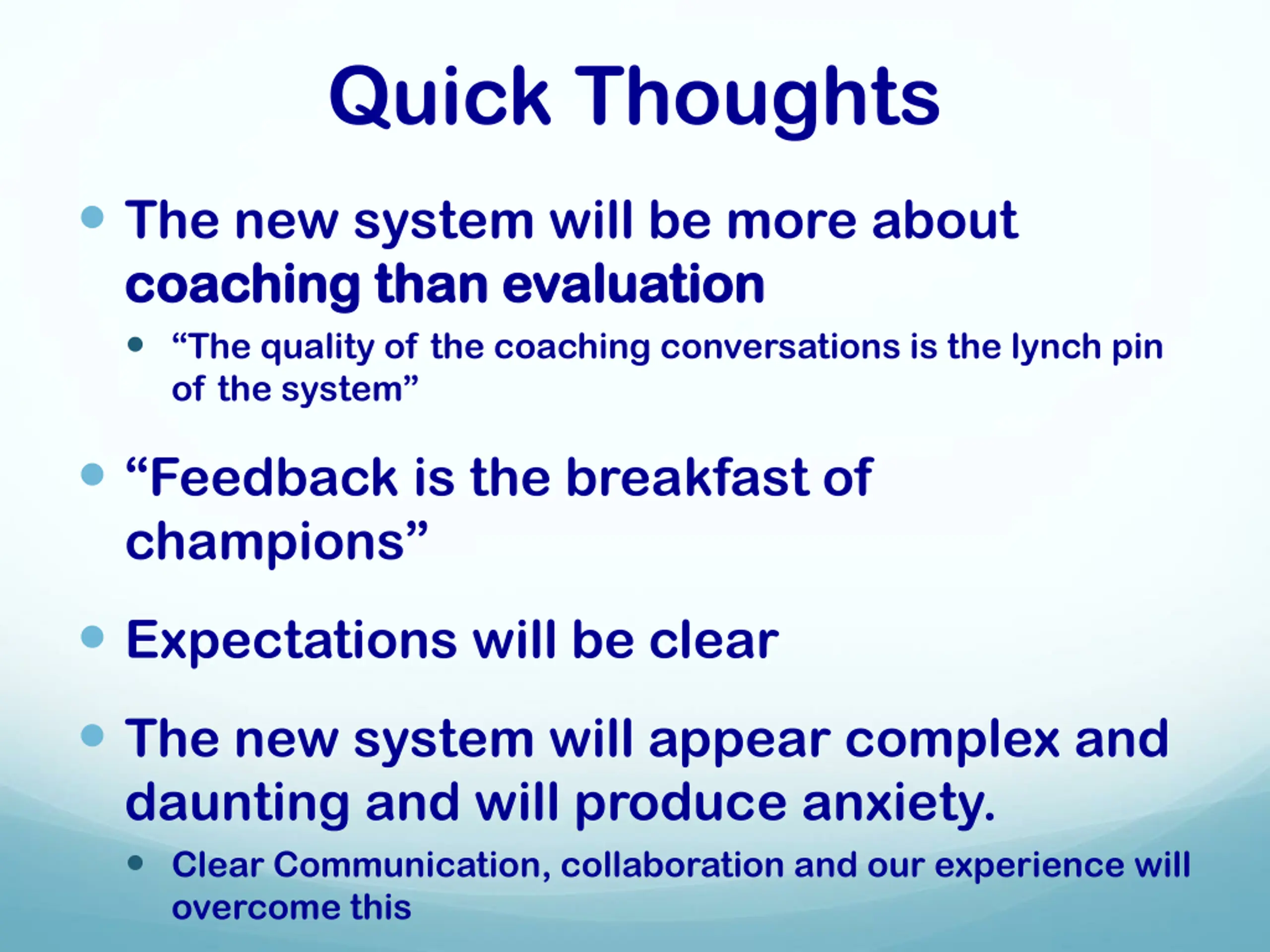 Quick Thoughts The new system will be more about coaching than evaluation coaching than evaluation The quality of the coaching conversations is the lynch pin of the system Feedback is the breakfast of champions Expectations will be clear The new system will appear complex and daunting and will produce anxiety. Clear Communication, collaboration and our experience will overcome this