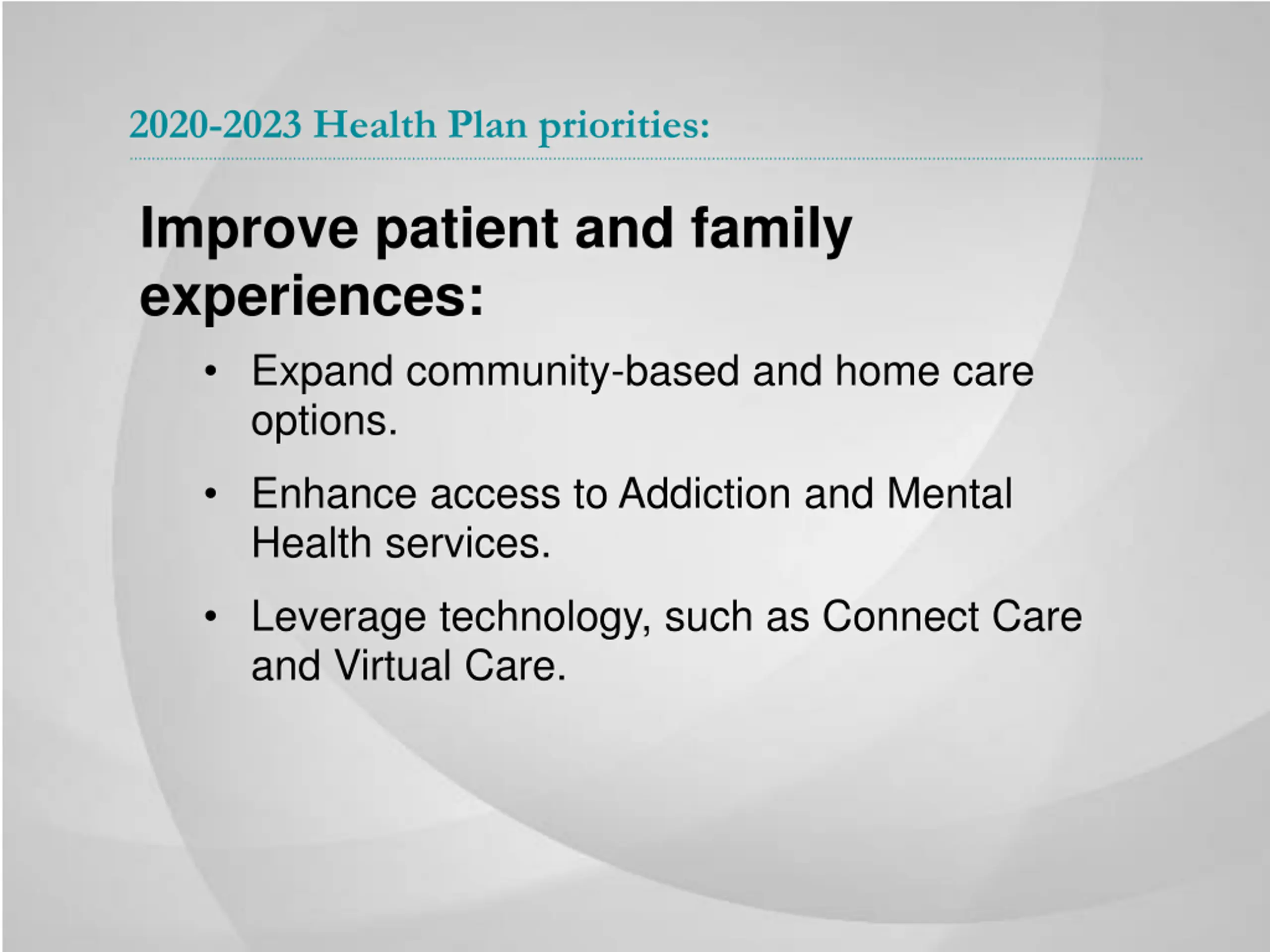 2020-2023 Health Plan priorities: Improve patient and family experiences: Expand community-based and home care options. Enhance access to Addiction and Mental Health services. Leverage technology, such as Connect Care and Virtual Care.
