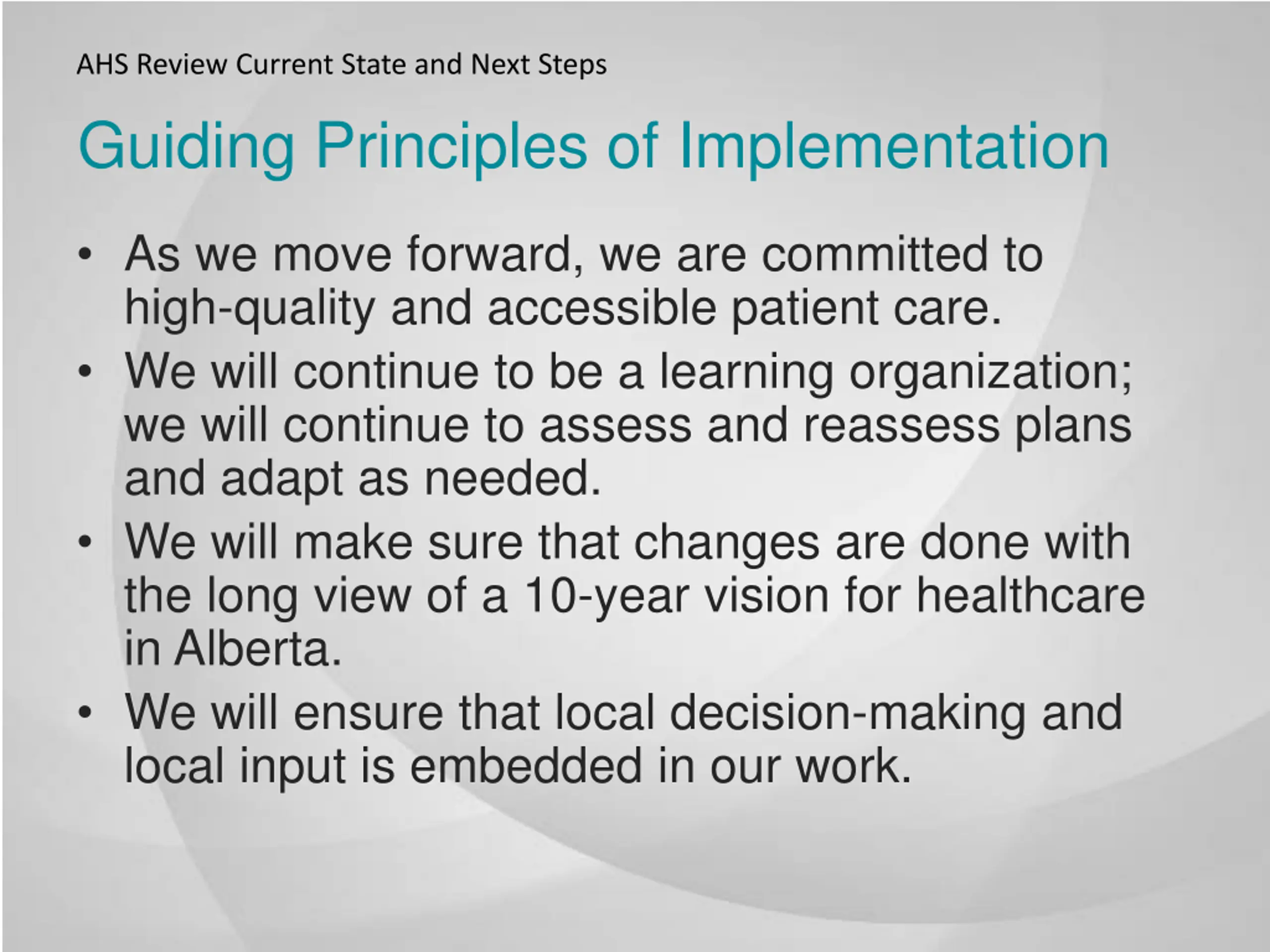 AHS Review Current State and Next Steps Guiding Principles of Implementation As we move forward, we are committed to high-quality and accessible patient care. We will continue to be a learning organization; we will continue to assess and reassess plans and adapt as needed. We will make sure that changes are done with the long view of a 10-year vision for healthcare in Alberta. We will ensure that local decision-making and local input is embedded in our work.