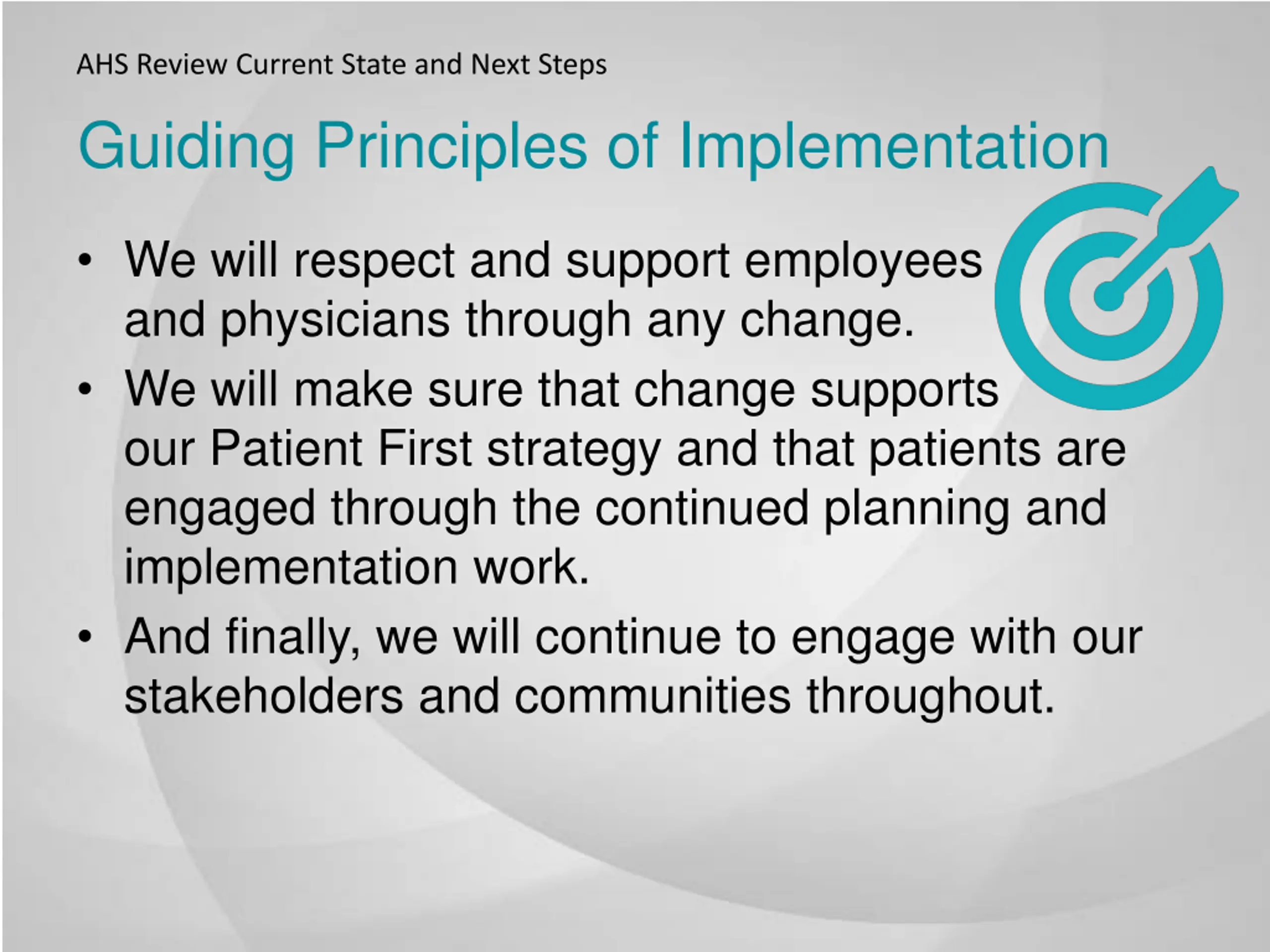 AHS Review Current State and Next Steps Guiding Principles of Implementation We will respect and support employees and physicians through any change. We will make sure that change supports our Patient First strategy and that patients are engaged through the continued planning and implementation work. And finally, we will continue to engage with our stakeholders and communities throughout.