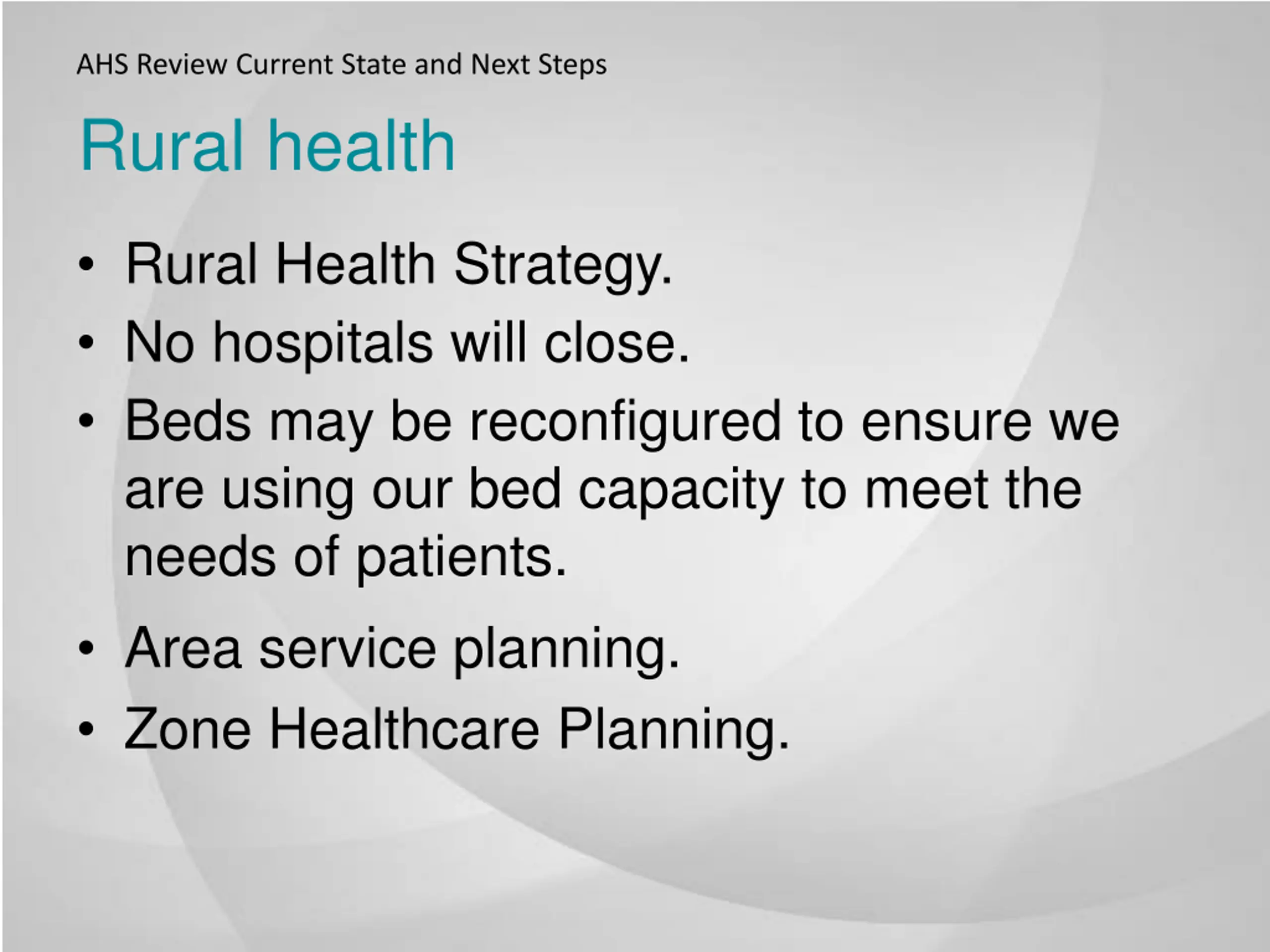 AHS Review Current State and Next Steps Rural health Rural Health Strategy. No hospitals will close. Beds may be reconfigured to ensure we are using our bed capacity to meet the needs of patients. Area service planning. Zone Healthcare Planning.