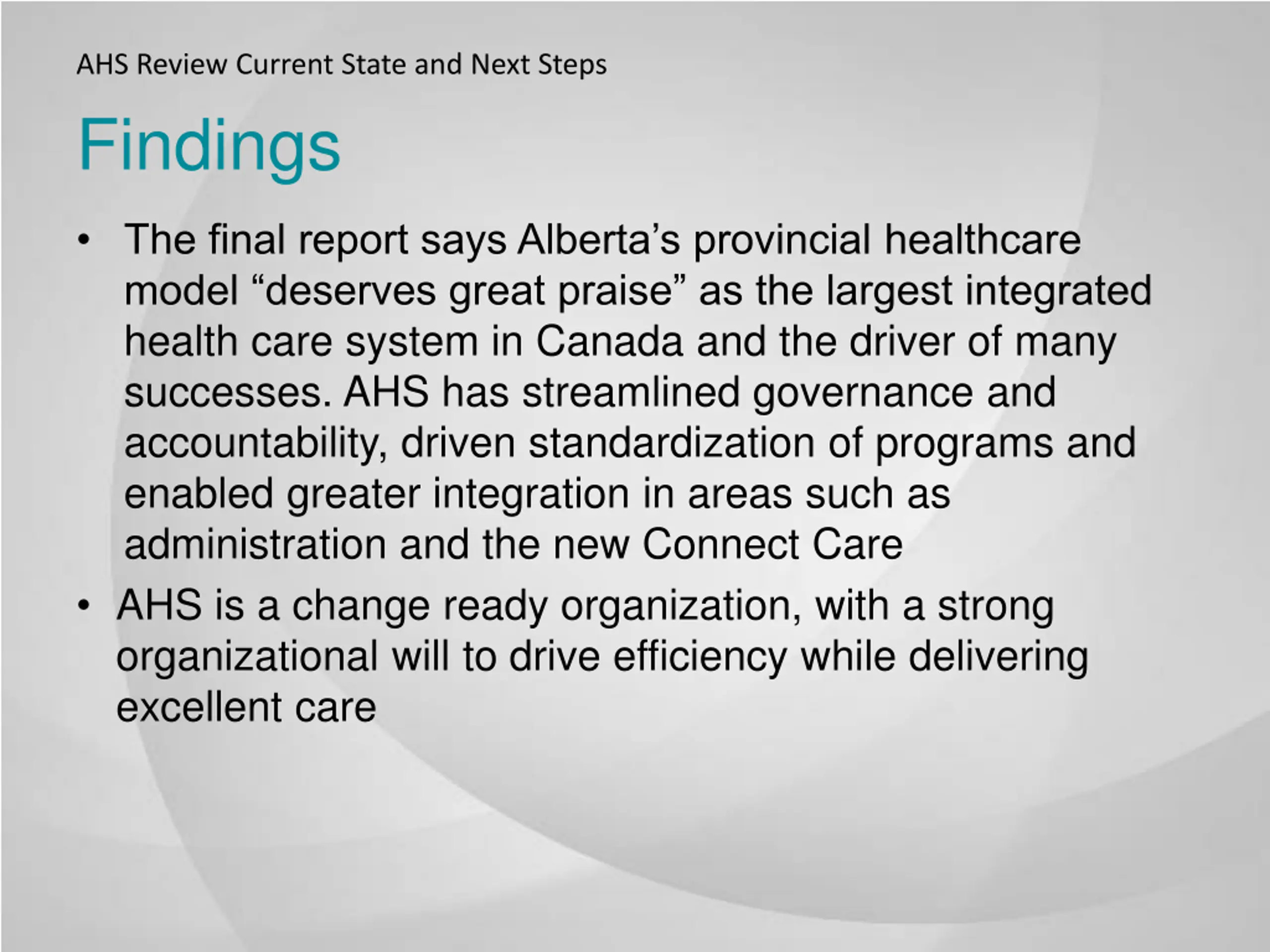AHS Review Current State and Next Steps Findings The final report says Alberta s provincial healthcare model deserves great praise as the largest integrated health care system in Canada and the driver of many successes. AHS has streamlined governance and accountability, driven standardization of programs and enabled greater integration in areas such as administration and the new Connect Care AHS is a change ready organization, with a strong organizational will to drive efficiency while delivering excellent care