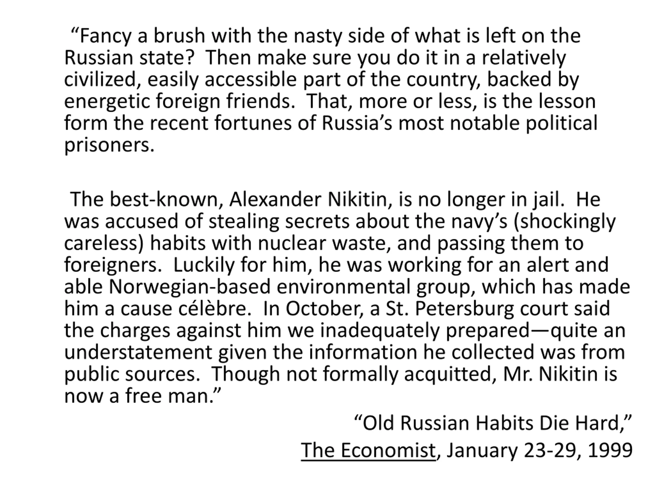 Fancy a brush with the nasty side of what is left on the Russian state? Then make sure you do it in a relatively civilized, easily accessible part of the country, backed by energetic foreign friends. That, more or less, is the lesson form the recent fortunes of Russia s most notable political prisoners. The best-known, Alexander Nikitin, is no longer in jail. He was accused of stealing secrets about the navy s (shockingly careless) habits with nuclear waste, and passing them to foreigners. Luckily for him, he was working for an alert and able Norwegian-based environmental group, which has made him a cause c l bre. In October, a St. Petersburg court said the charges against him we inadequately prepared quite an understatement given the information he collected was from public sources. Though not formally acquitted, Mr. Nikitin is now a free man. Old Russian Habits Die Hard, The Economist, January 23-29, 1999