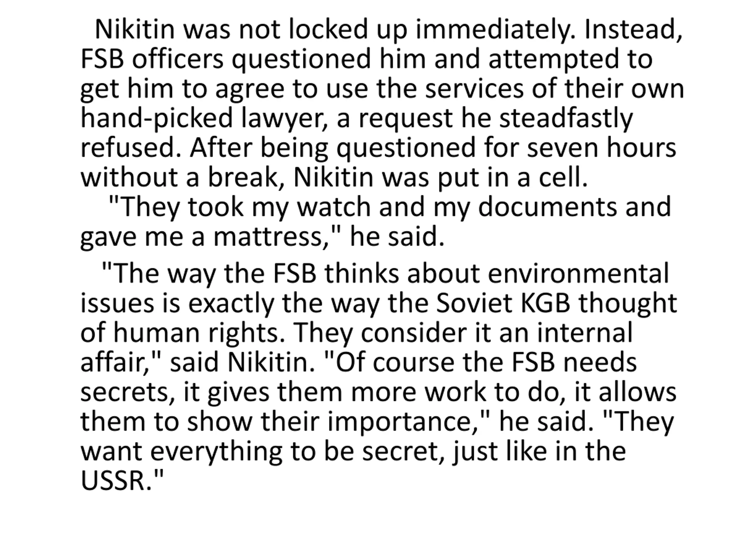 Nikitin was not locked up immediately. Instead, FSB officers questioned him and attempted to get him to agree to use the services of their own hand-picked lawyer, a request he steadfastly refused. After being questioned for seven hours without a break, Nikitin was put in a cell. "They took my watch and my documents and gave me a mattress," he said. "The way the FSB thinks about environmental issues is exactly the way the Soviet KGB thought of human rights. They consider it an internal affair," said Nikitin. "Of course the FSB needs secrets, it gives them more work to do, it allows them to show their importance," he said. "They want everything to be secret, just like in the USSR."