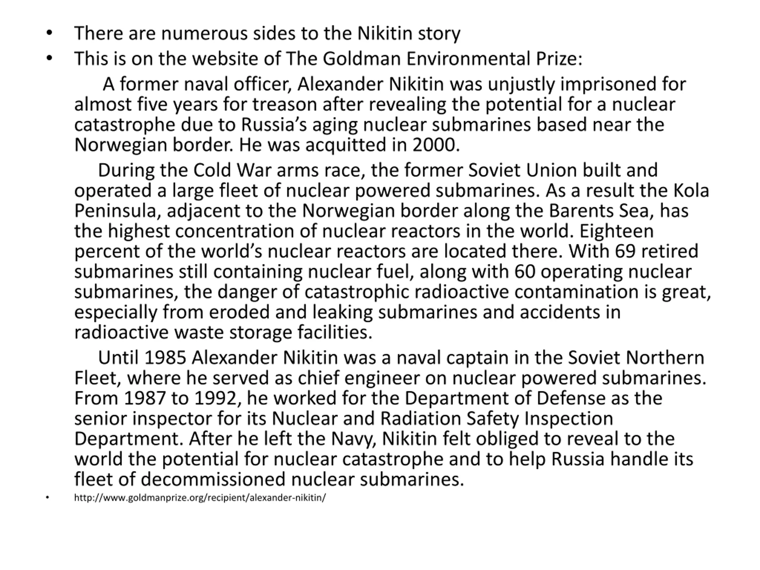 There are numerous sides to the Nikitin story This is on the website of The Goldman Environmental Prize: A former naval officer, Alexander Nikitin was unjustly imprisoned for almost five years for treason after revealing the potential for a nuclear catastrophe due to Russia s aging nuclear submarines based near the Norwegian border. He was acquitted in 2000. During the Cold War arms race, the former Soviet Union built and operated a large fleet of nuclear powered submarines. As a result the Kola Peninsula, adjacent to the Norwegian border along the Barents Sea, has the highest concentration of nuclear reactors in the world. Eighteen percent of the world s nuclear reactors are located there. With 69 retired submarines still containing nuclear fuel, along with 60 operating nuclear submarines, the danger of catastrophic radioactive contamination is great, especially from eroded and leaking submarines and accidents in radioactive waste storage facilities. Until 1985 Alexander Nikitin was a naval captain in the Soviet Northern Fleet, where he served as chief engineer on nuclear powered submarines. From 1987 to 1992, he worked for the Department of Defense as the senior inspector for its Nuclear and Radiation Safety Inspection Department. After he left the Navy, Nikitin felt obliged to reveal to the world the potential for nuclear catastrophe and to help Russia handle its fleet of decommissioned nuclear submarines. http://www.goldmanprize.org/recipient/alexander-nikitin/