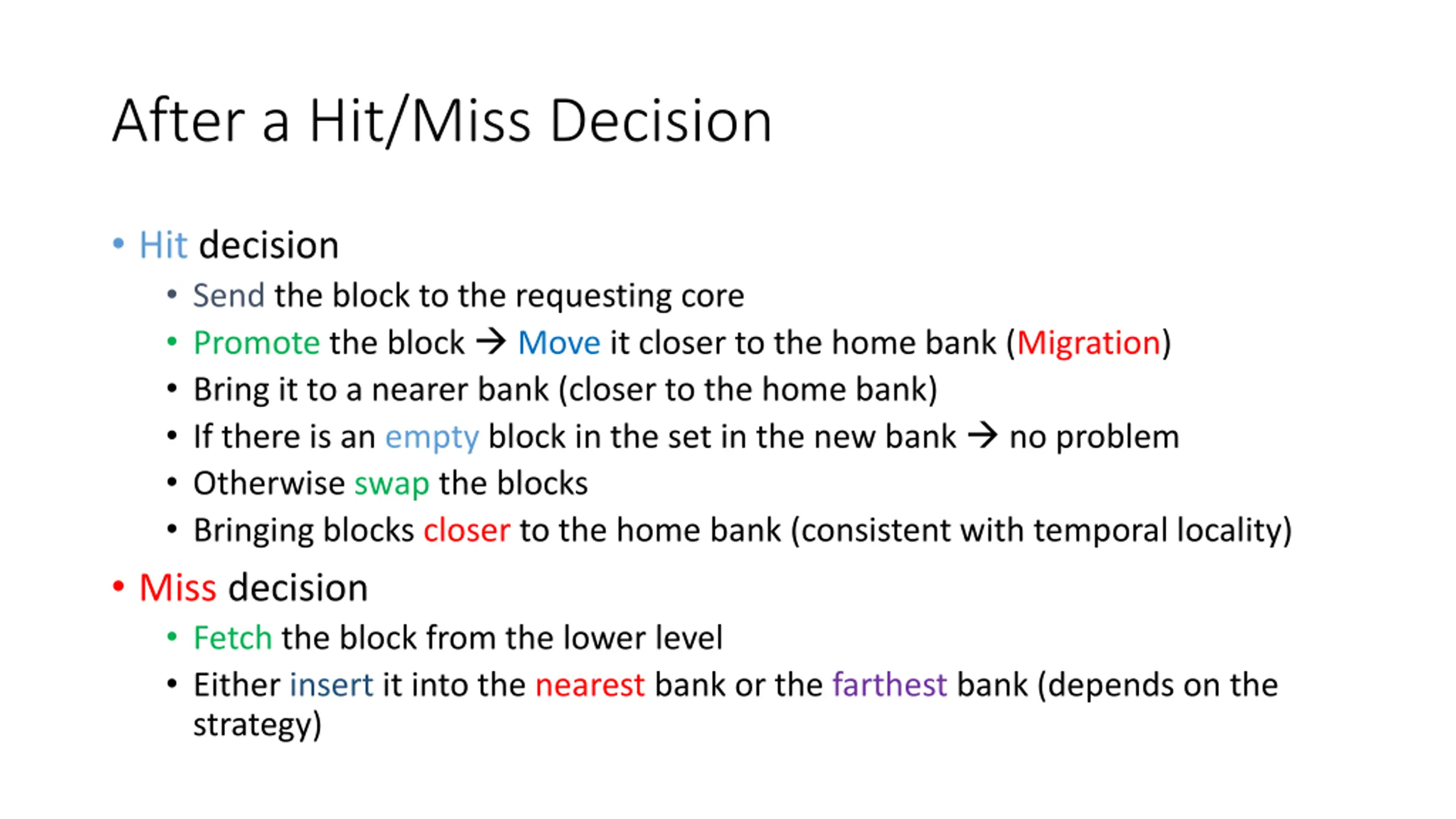 After a Hit/Miss Decision Hit decision Send the block to the requesting core Promote the block Move it closer to the home bank (Migration) Bring it to a nearer bank (closer to the home bank) If there is an empty block in the set in the new bank no problem Otherwise swap the blocks Bringing blocks closer to the home bank (consistent with temporal locality) Miss decision Fetch the block from the lower level Either insert it into the nearest bank or the farthest bank (depends on the strategy)