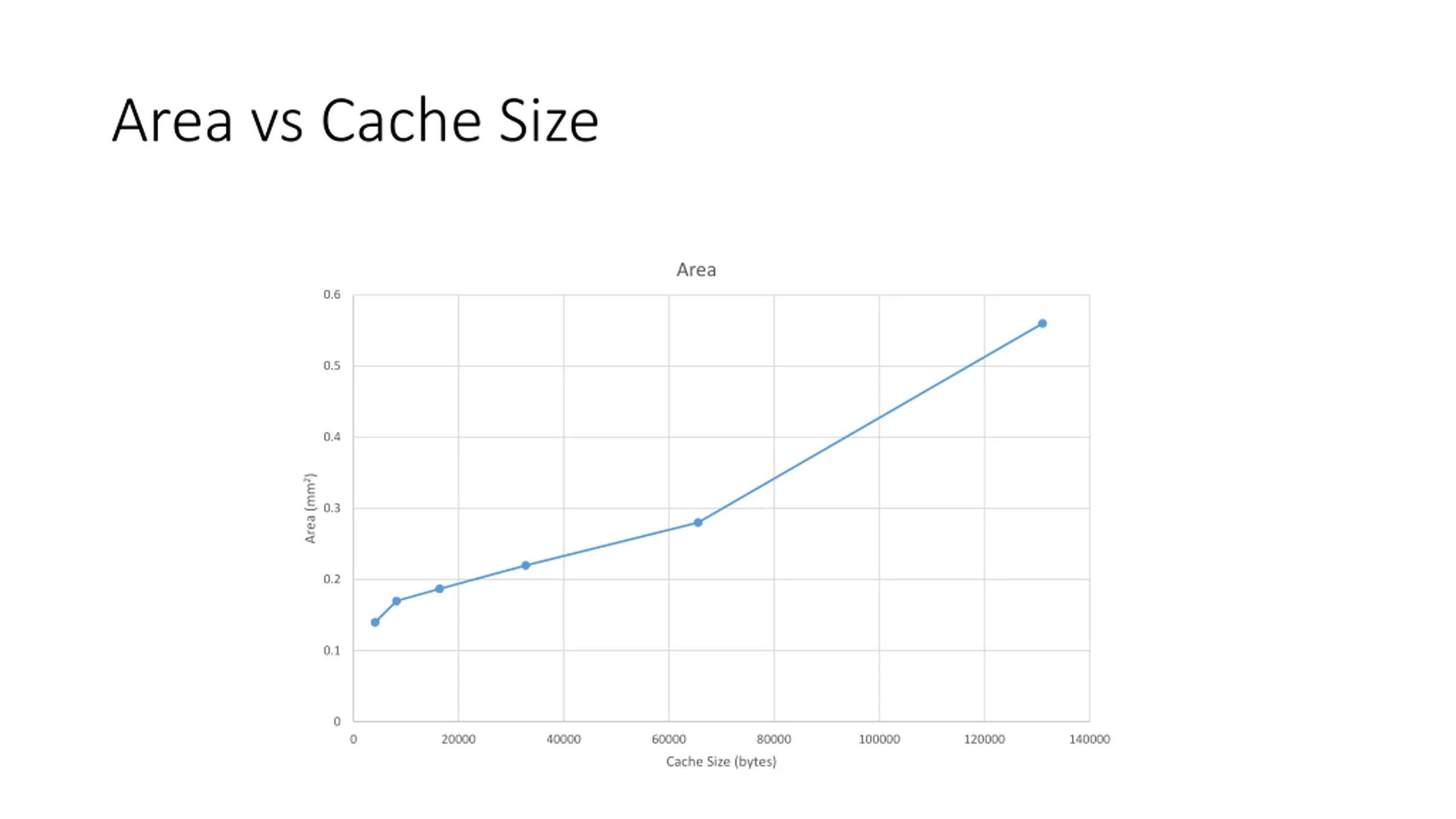 Area vs Cache Size Area 0.6 0.5 0.4 Area (mm2) 0.3 0.2 0.1 0 0 20000 40000 60000 80000 100000 120000 140000 Cache Size (bytes)