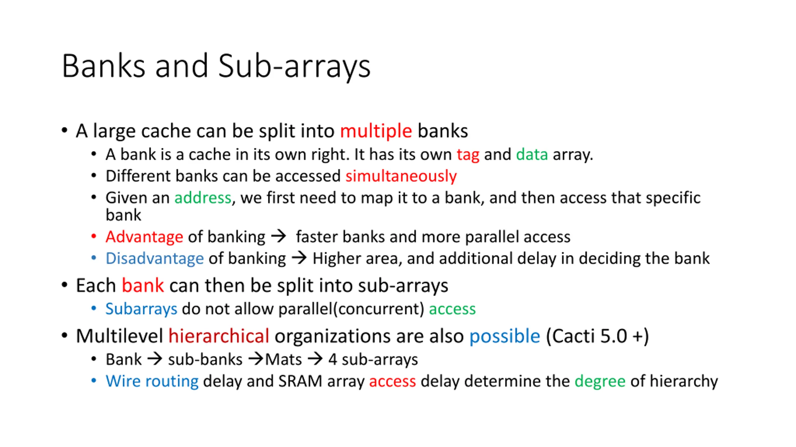 Banks and Sub-arrays A large cache can be split into multiple banks A bank is a cache in its own right. It has its own tag and data array. Different banks can be accessed simultaneously Given an address, we first need to map it to a bank, and then access that specific bank Advantage of banking faster banks and more parallel access Disadvantage of banking Higher area, and additional delay in deciding the bank Each bank can then be split into sub-arrays Subarrays do not allow parallel(concurrent) access Multilevel hierarchical organizations are also possible (Cacti 5.0 +) Bank sub-banks Mats 4 sub-arrays Wire routing delay and SRAM array access delay determine the degree of hierarchy