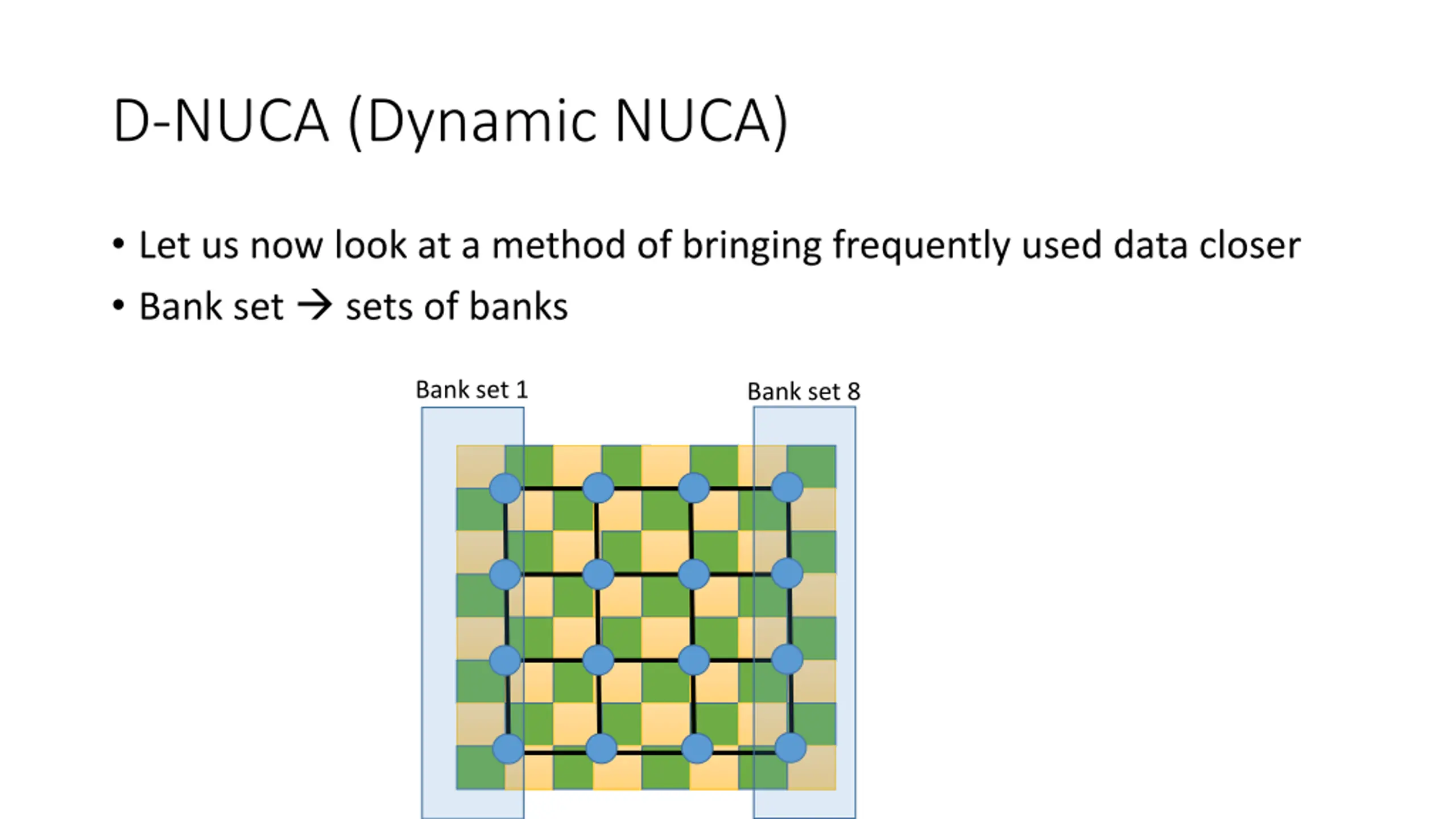 D-NUCA (Dynamic NUCA) Let us now look at a method of bringing frequently used data closer Bank set sets of banks Bank set 1 Bank set 8
