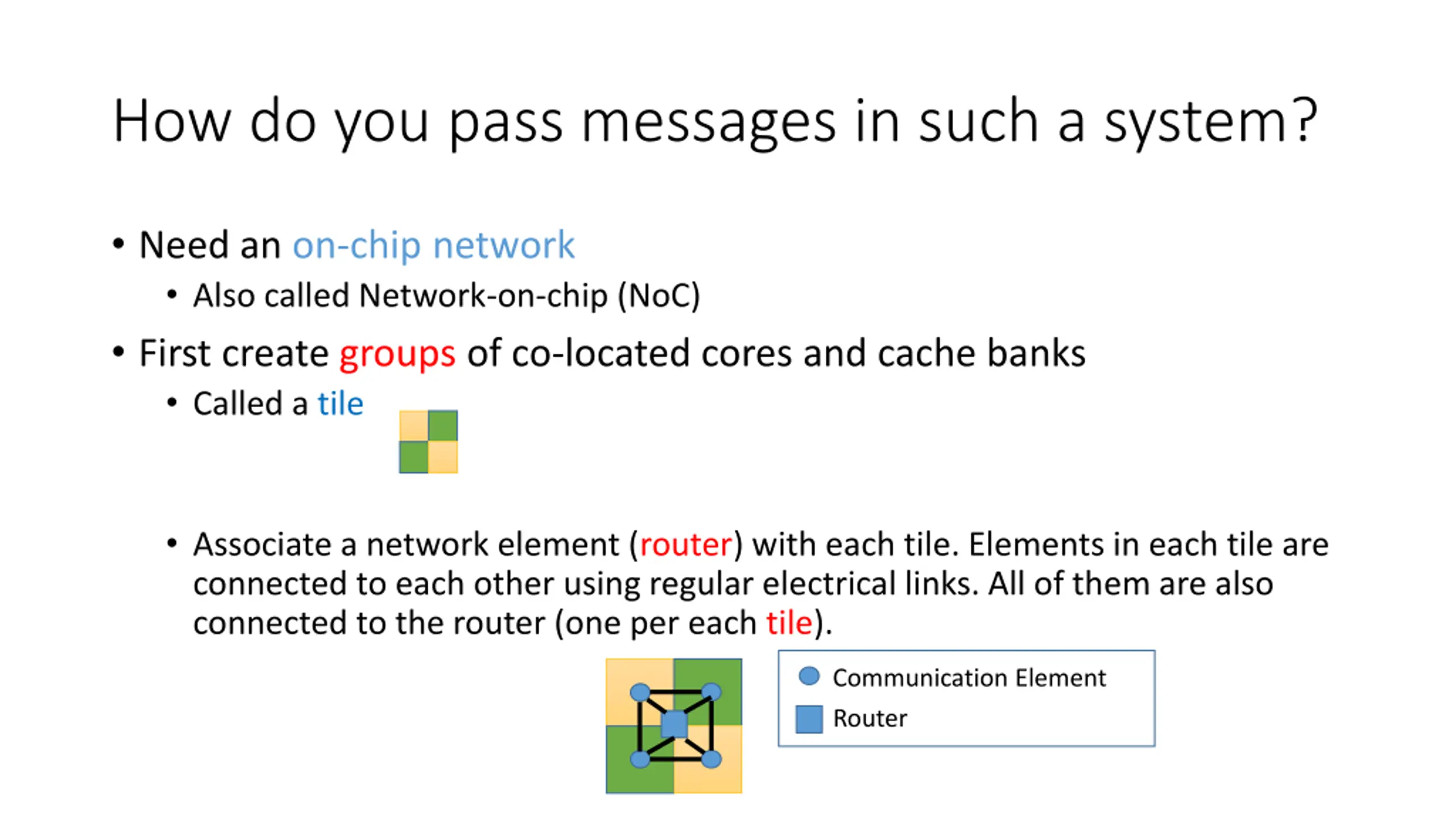 How do you pass messages in such a system? Need an on-chip network Also called Network-on-chip (NoC) First create groups of co-located cores and cache banks Called a tile Associate a network element (router) with each tile. Elements in each tile are connected to each other using regular electrical links. All of them are also connected to the router (one per each tile). Communication Element Router
