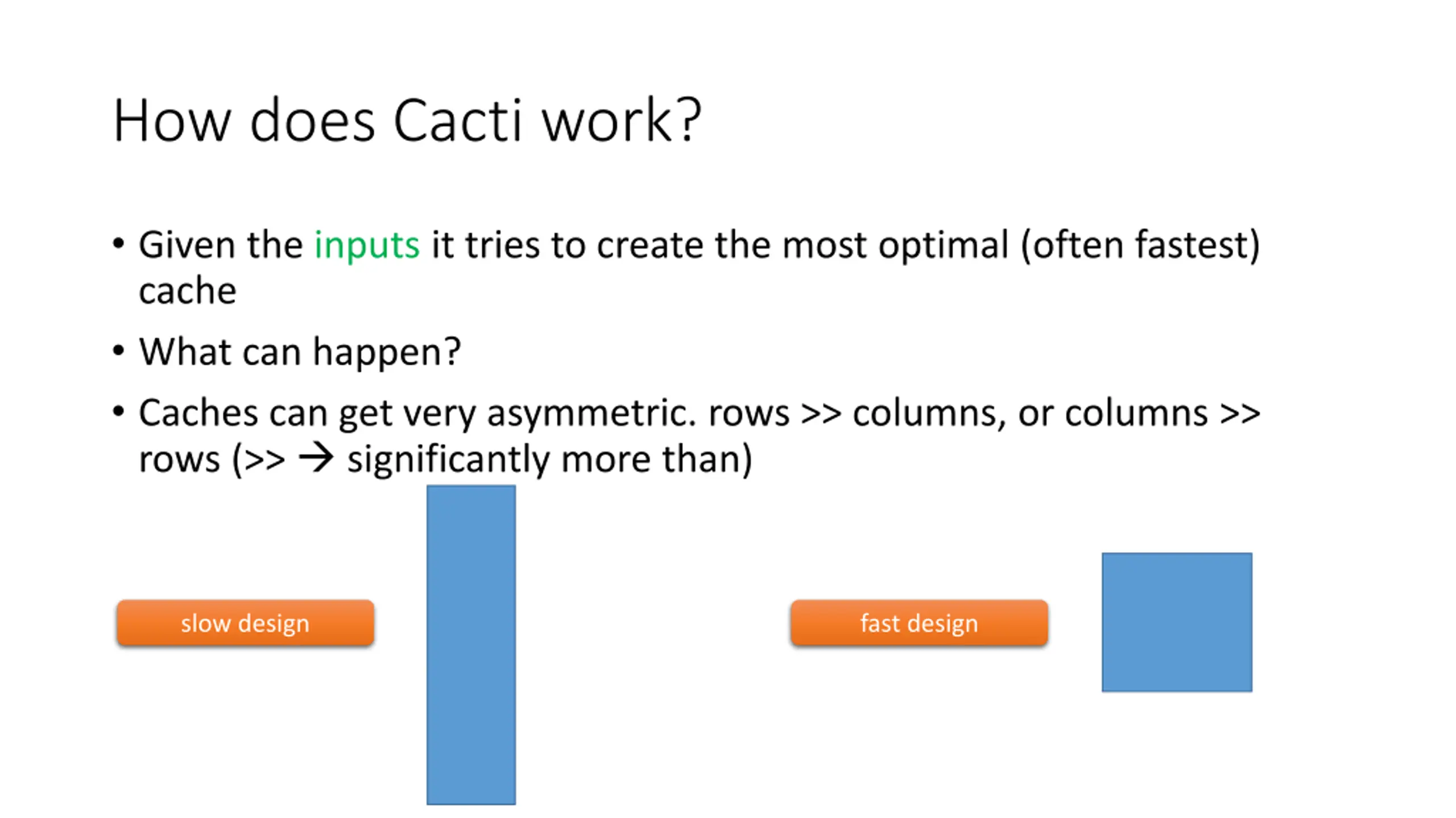 How does Cacti work? Given the inputs it tries to create the most optimal (often fastest) cache What can happen? Caches can get very asymmetric. rows >> columns, or columns >> rows (>> significantly more than) slow design fast design