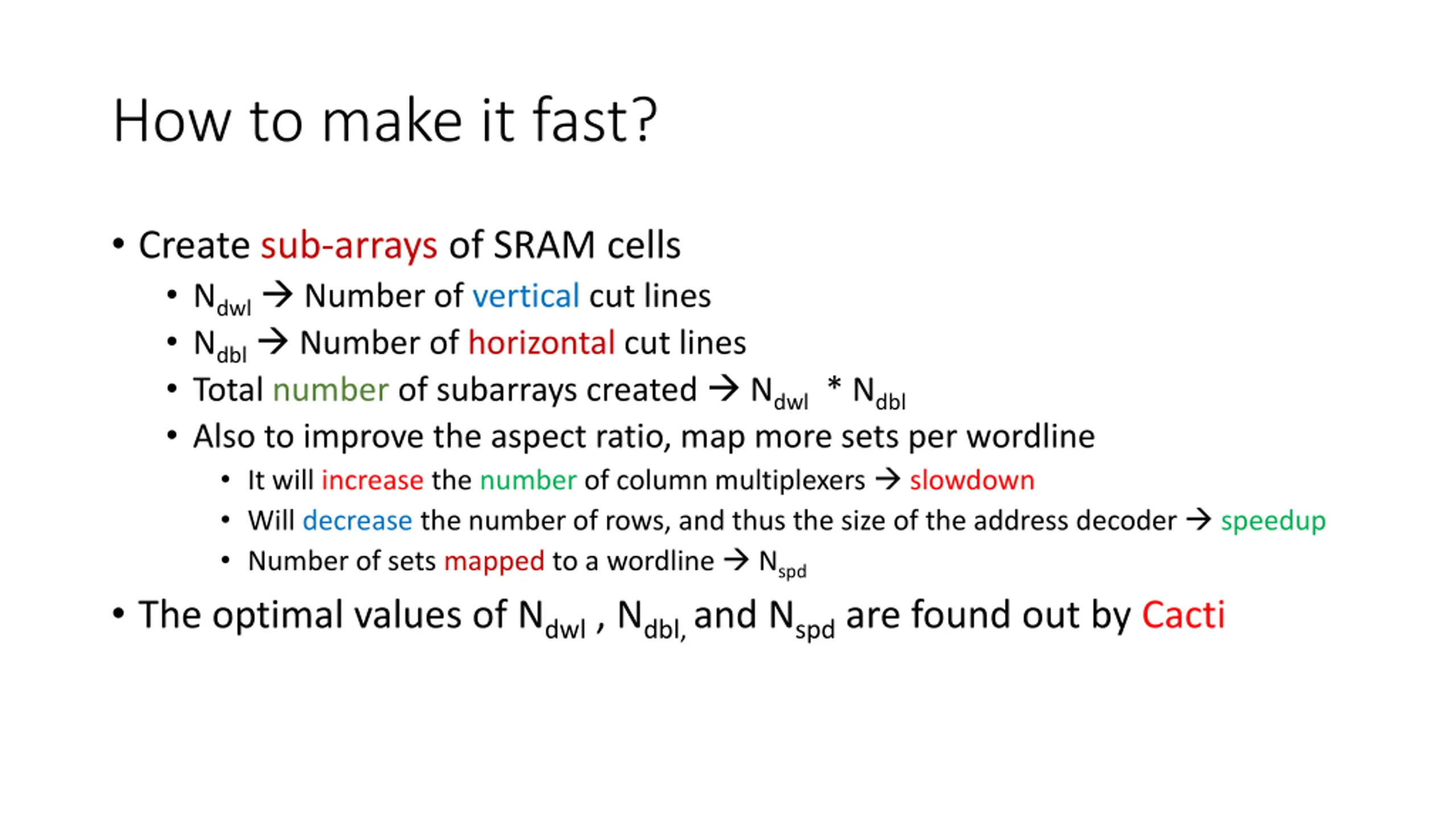 How to make it fast? Create sub-arrays of SRAM cells Ndwl Number of vertical cut lines Ndbl Number of horizontal cut lines Total number of subarrays created Ndwl * Ndbl Also to improve the aspect ratio, map more sets per wordline It will increase the number of column multiplexers slowdown Will decrease the number of rows, and thus the size of the address decoder speedup Number of sets mapped to a wordline Nspd The optimal values of Ndwl , Ndbl, and Nspd are found out by Cacti