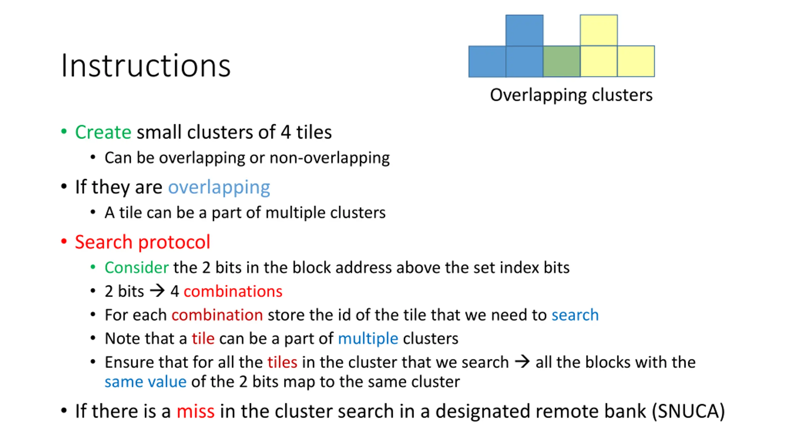 Instructions Overlapping clusters Create small clusters of 4 tiles Can be overlapping or non-overlapping If they are overlapping A tile can be a part of multiple clusters Search protocol Consider the 2 bits in the block address above the set index bits 2 bits 4 combinations For each combination store the id of the tile that we need to search Note that a tile can be a part of multiple clusters Ensure that for all the tiles in the cluster that we search all the blocks with the same value of the 2 bits map to the same cluster If there is a miss in the cluster search in a designated remote bank (SNUCA)