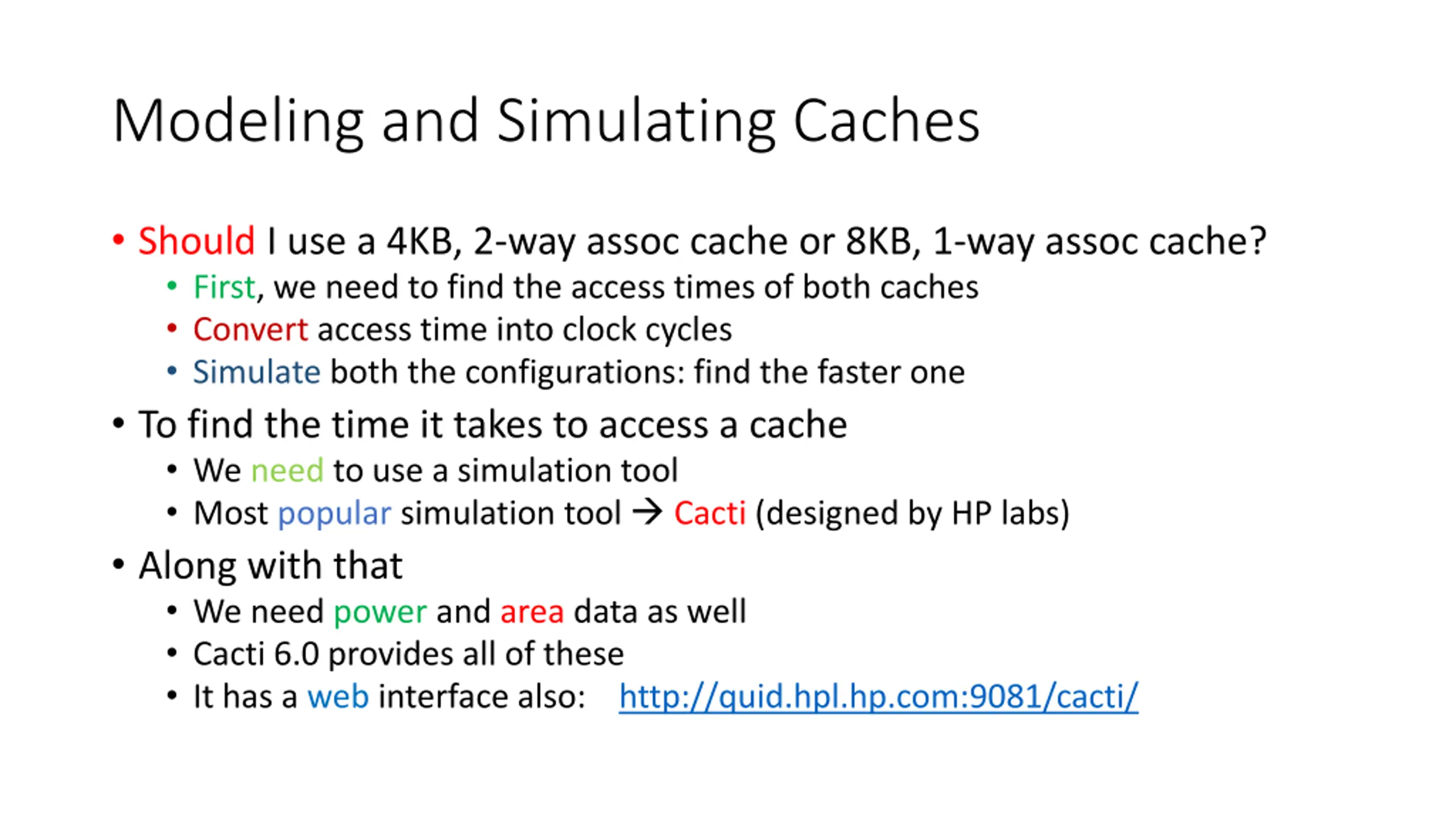 Modeling and Simulating Caches Should I use a 4KB, 2-way assoc cache or 8KB, 1-way assoc cache? First, we need to find the access times of both caches Convert access time into clock cycles Simulate both the configurations: find the faster one To find the time it takes to access a cache We need to use a simulation tool Most popular simulation tool Cacti (designed by HP labs) Along with that We need power and area data as well Cacti 6.0 provides all of these It has a web interface also: http://quid.hpl.hp.com:9081/cacti/