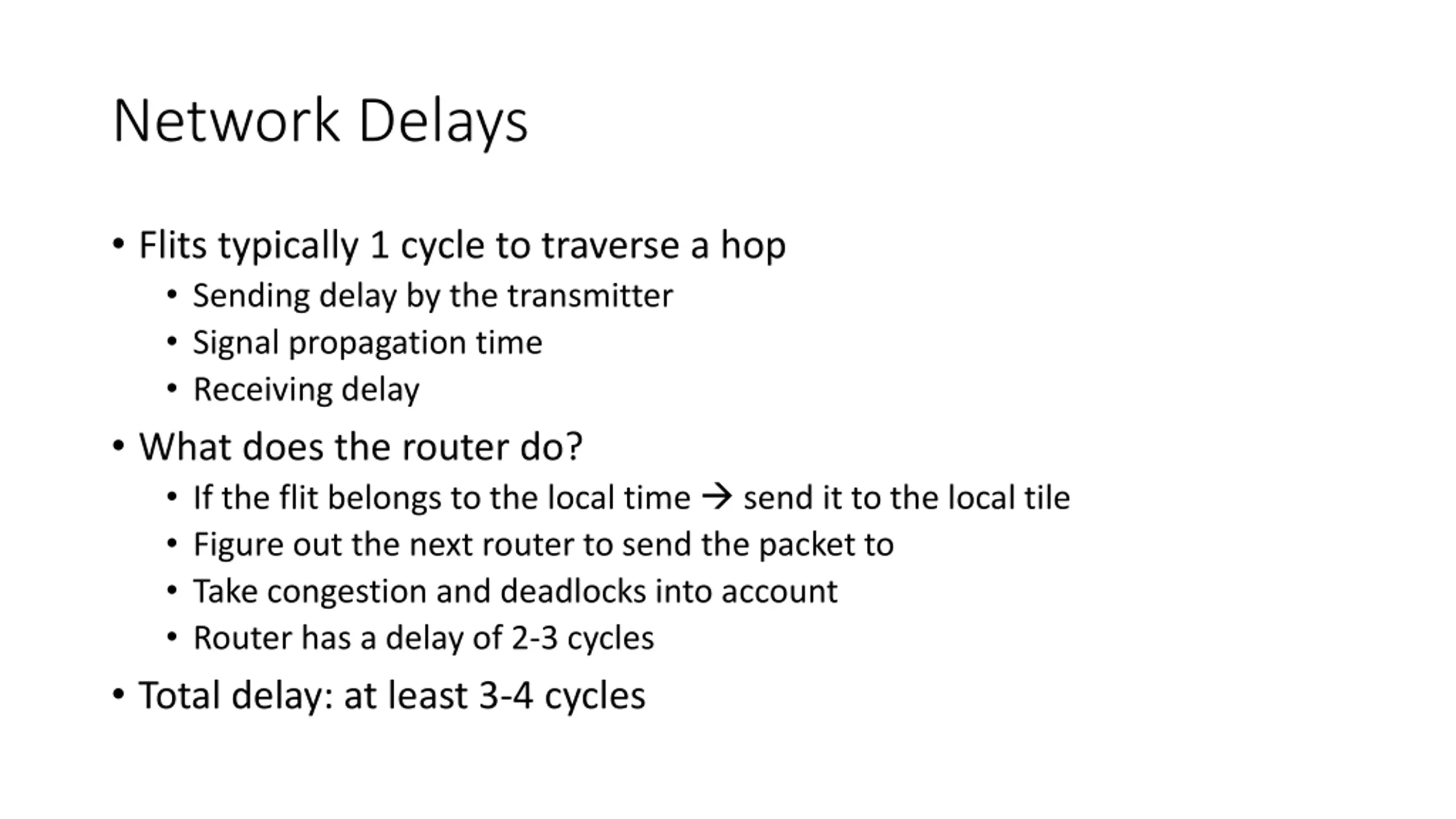 Network Delays Flits typically 1 cycle to traverse a hop Sending delay by the transmitter Signal propagation time Receiving delay What does the router do? If the flit belongs to the local time send it to the local tile Figure out the next router to send the packet to Take congestion and deadlocks into account Router has a delay of 2-3 cycles Total delay: at least 3-4 cycles