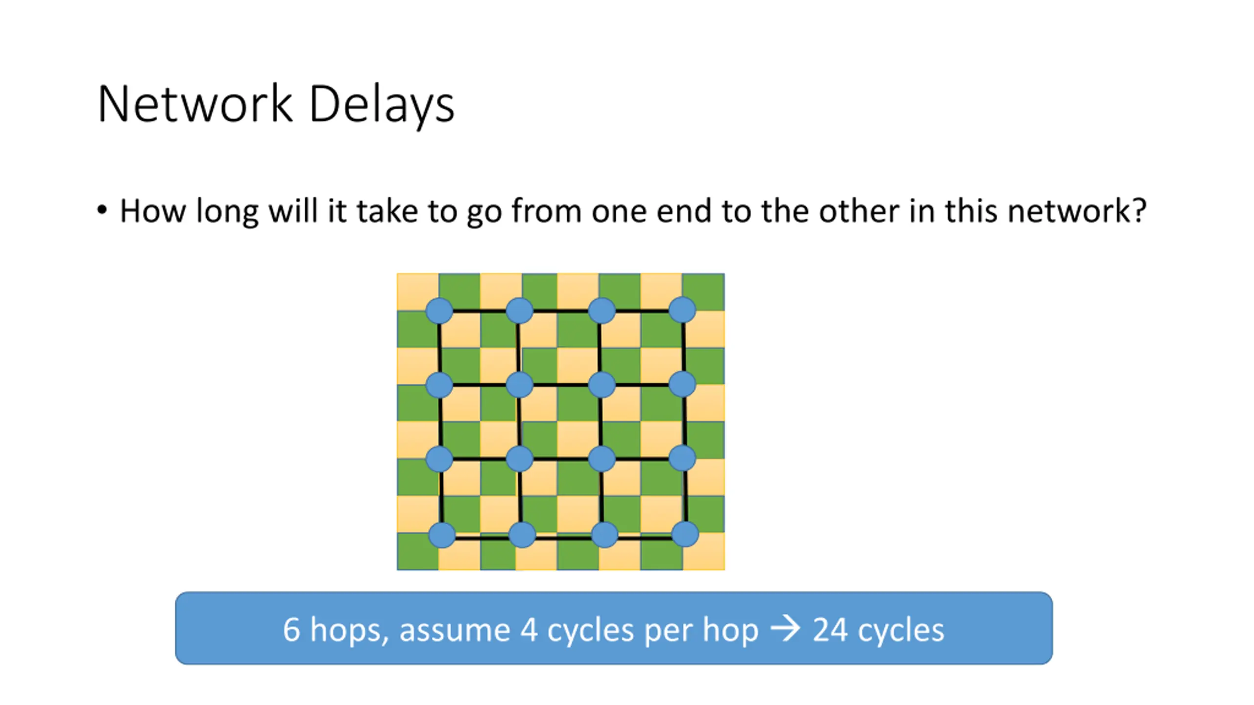 Network Delays How long will it take to go from one end to the other in this network? 6 hops, assume 4 cycles per hop 24 cycles