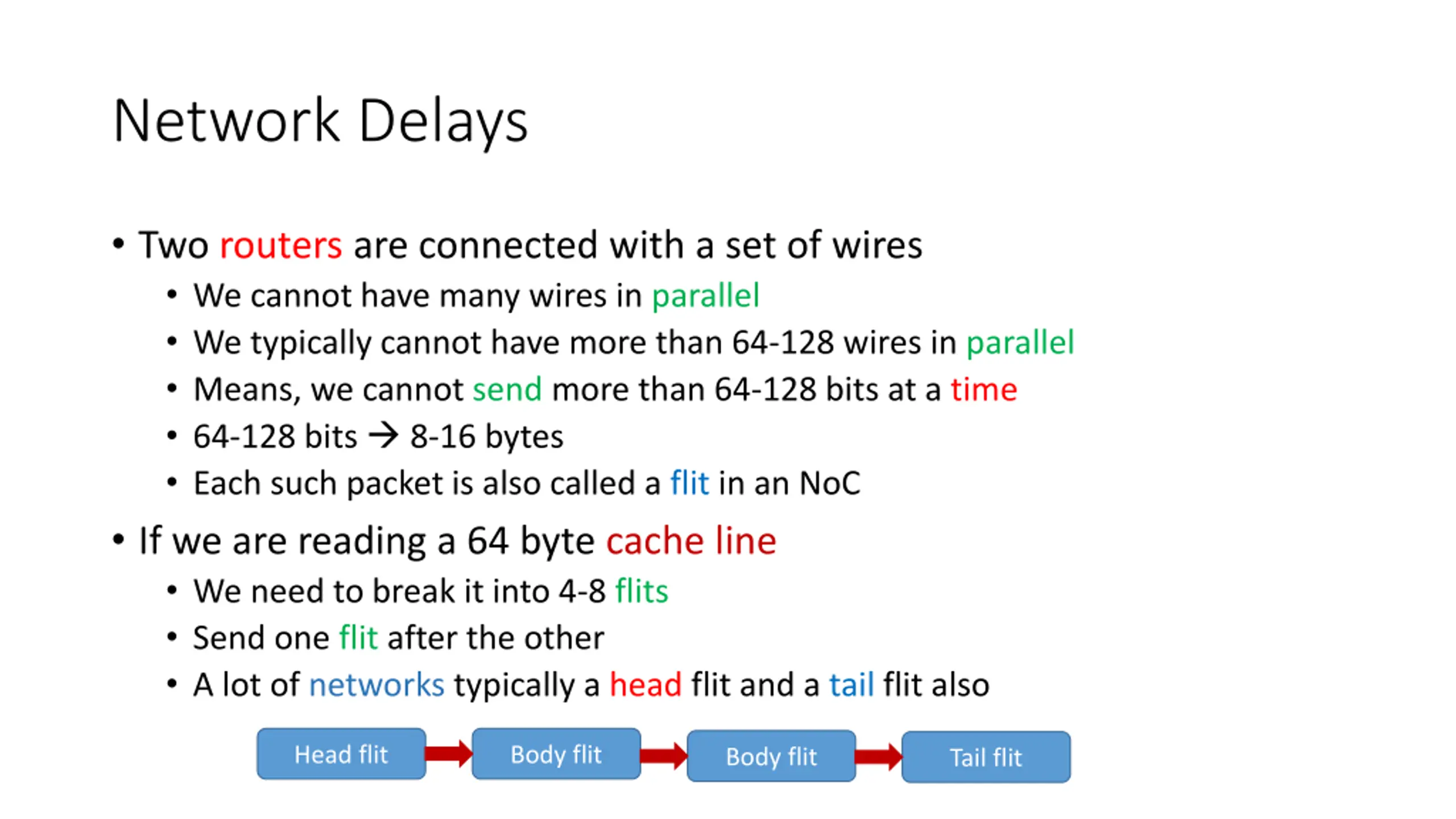 Network Delays Two routers are connected with a set of wires We cannot have many wires in parallel We typically cannot have more than 64-128 wires in parallel Means, we cannot send more than 64-128 bits at a time 64-128 bits 8-16 bytes Each such packet is also called a flit in an NoC If we are reading a 64 byte cache line We need to break it into 4-8 flits Send one flit after the other A lot of networks typically a head flit and a tail flit also Head flit Body flit Body flit Tail flit