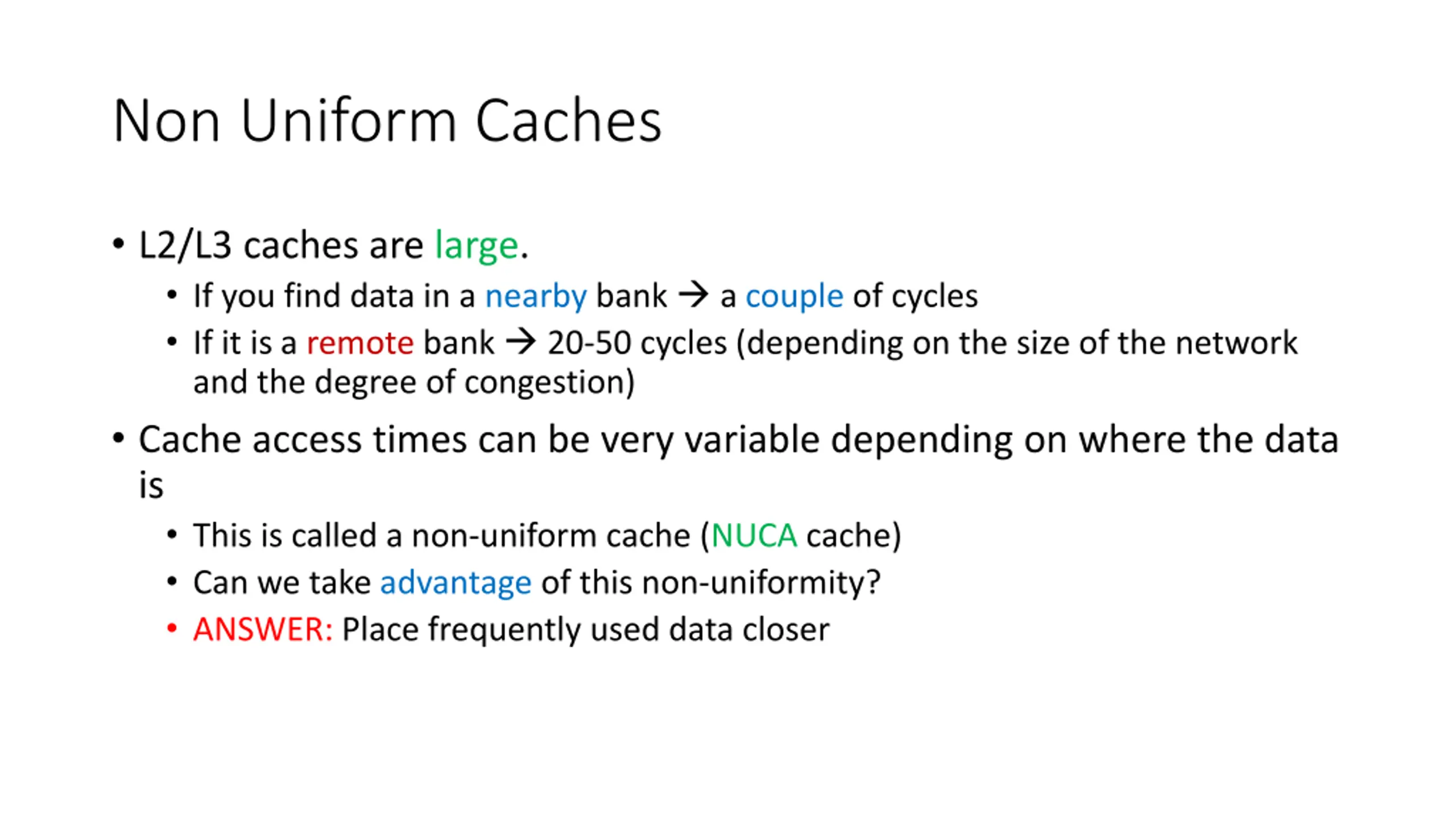 Non Uniform Caches L2/L3 caches are large. If you find data in a nearby bank a couple of cycles If it is a remote bank 20-50 cycles (depending on the size of the network and the degree of congestion) Cache access times can be very variable depending on where the data is This is called a non-uniform cache (NUCA cache) Can we take advantage of this non-uniformity? ANSWER: Place frequently used data closer