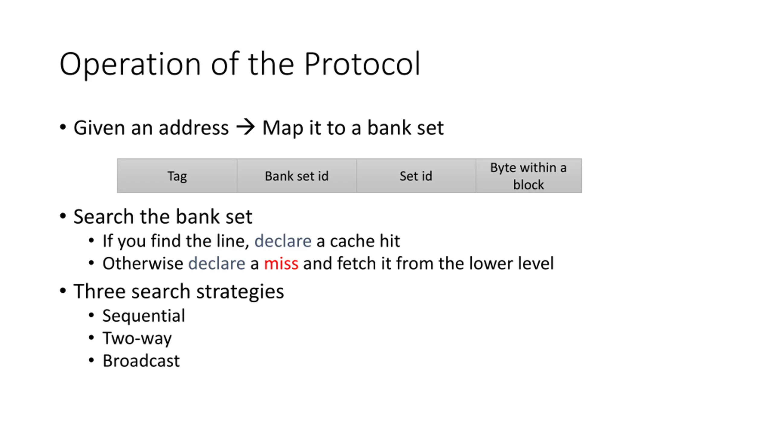 Operation of the Protocol Given an address Map it to a bank set Byte within a block Tag Bank set id Set id Search the bank set If you find the line, declare a cache hit Otherwise declare a miss and fetch it from the lower level Three search strategies Sequential Two-way Broadcast