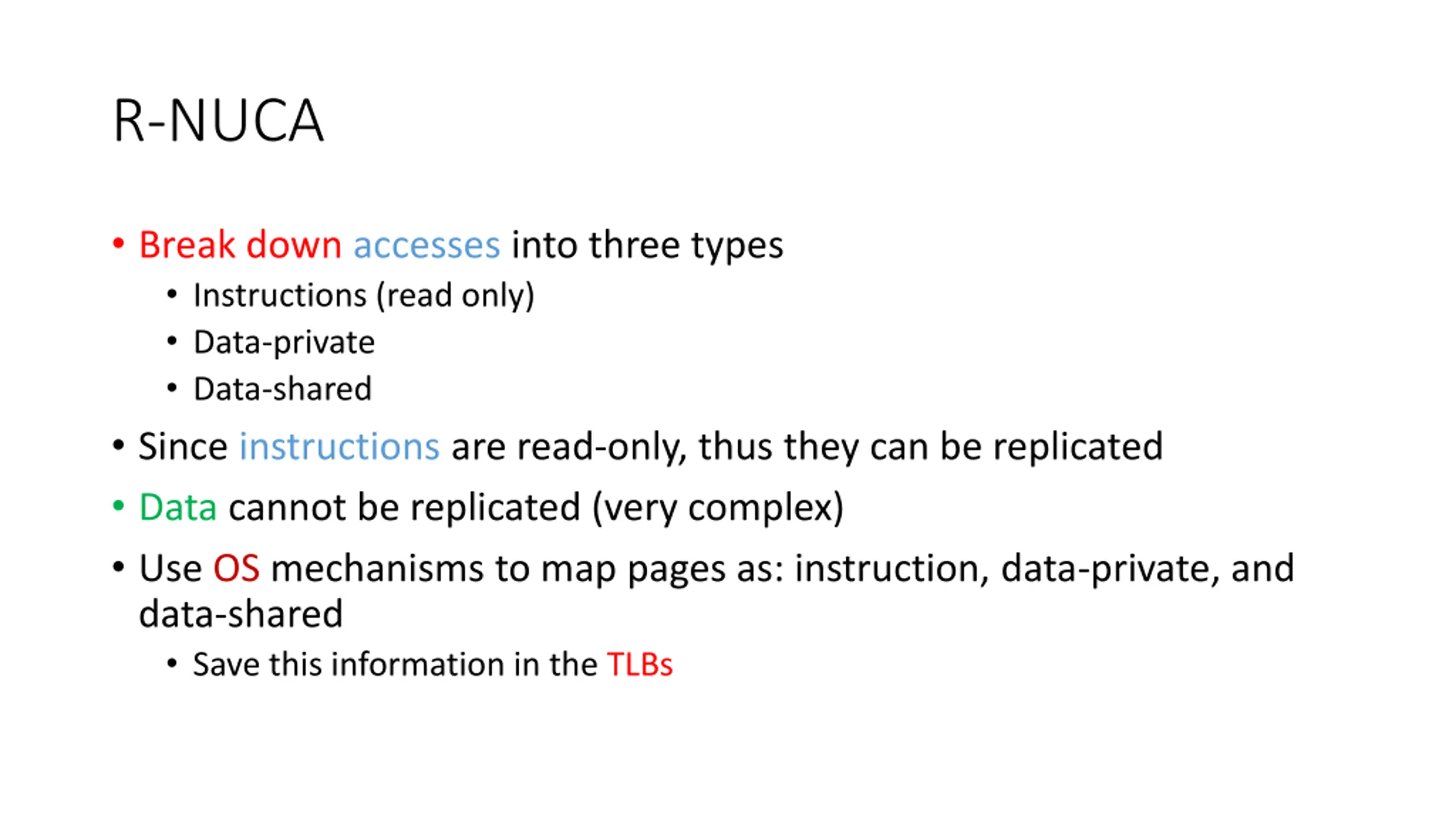 R-NUCA Break down accesses into three types Instructions (read only) Data-private Data-shared Since instructions are read-only, thus they can be replicated Data cannot be replicated (very complex) Use OS mechanisms to map pages as: instruction, data-private, and data-shared Save this information in the TLBs