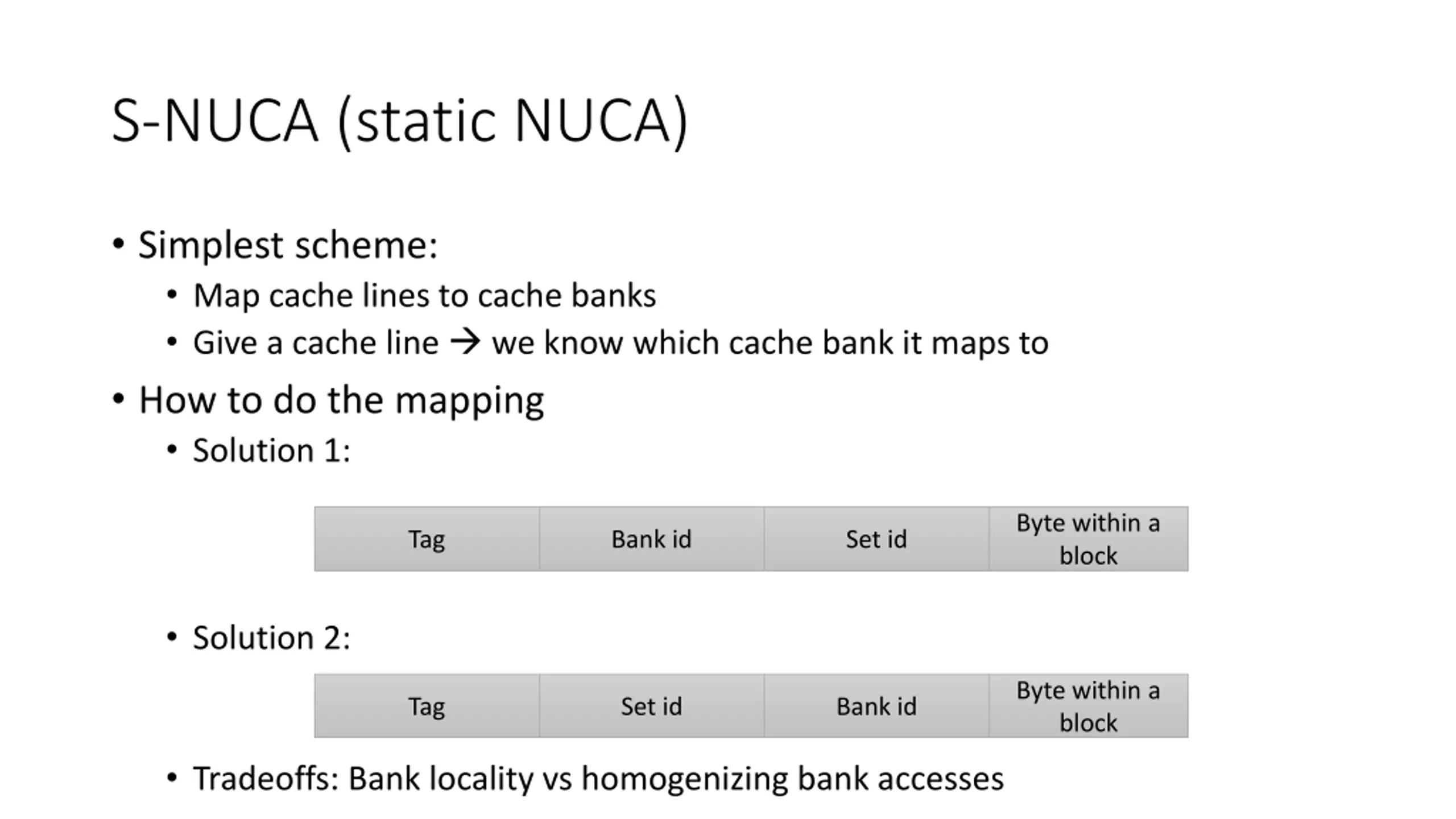 S-NUCA (static NUCA) Simplest scheme: Map cache lines to cache banks Give a cache line we know which cache bank it maps to How to do the mapping Solution 1: Byte within a block Tag Bank id Set id Solution 2: Byte within a block Set id Bank id Tag Tradeoffs: Bank locality vs homogenizing bank accesses