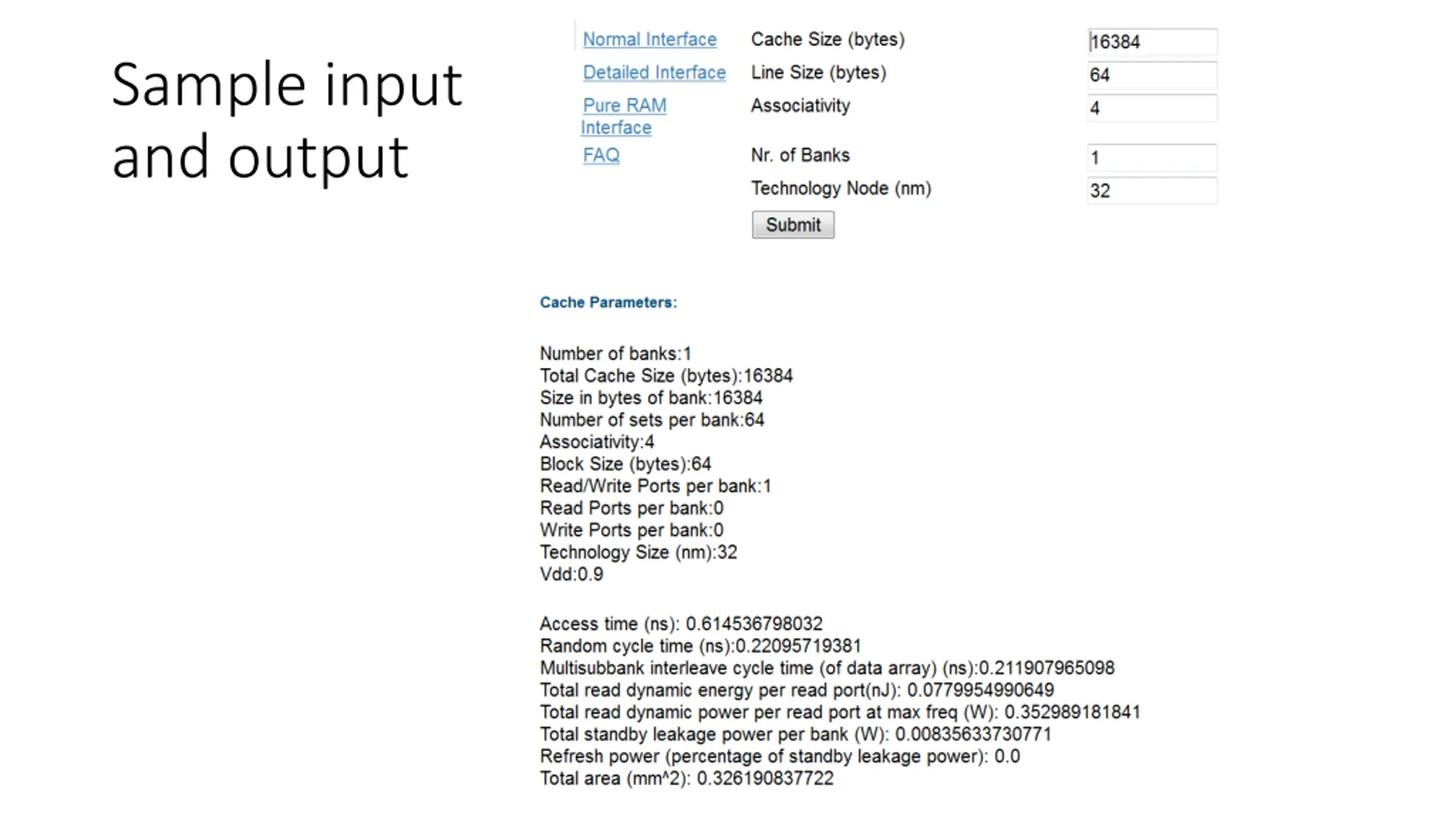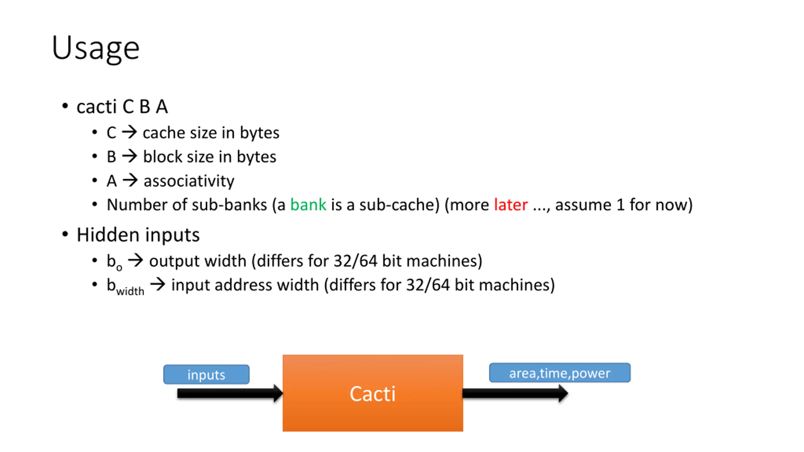 Usage cacti C B A C cache size in bytes B block size in bytes A associativity Number of sub-banks (a bank is a sub-cache) (more later ..., assume 1 for now) Hidden inputs bo output width (differs for 32/64 bit machines) bwidth input address width (differs for 32/64 bit machines) area,time,power inputs Cacti