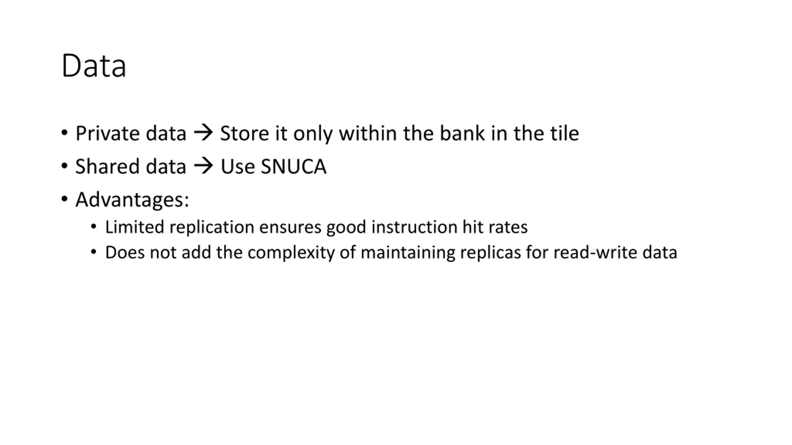 Data Private data Store it only within the bank in the tile Shared data Use SNUCA Advantages: Limited replication ensures good instruction hit rates Does not add the complexity of maintaining replicas for read-write data