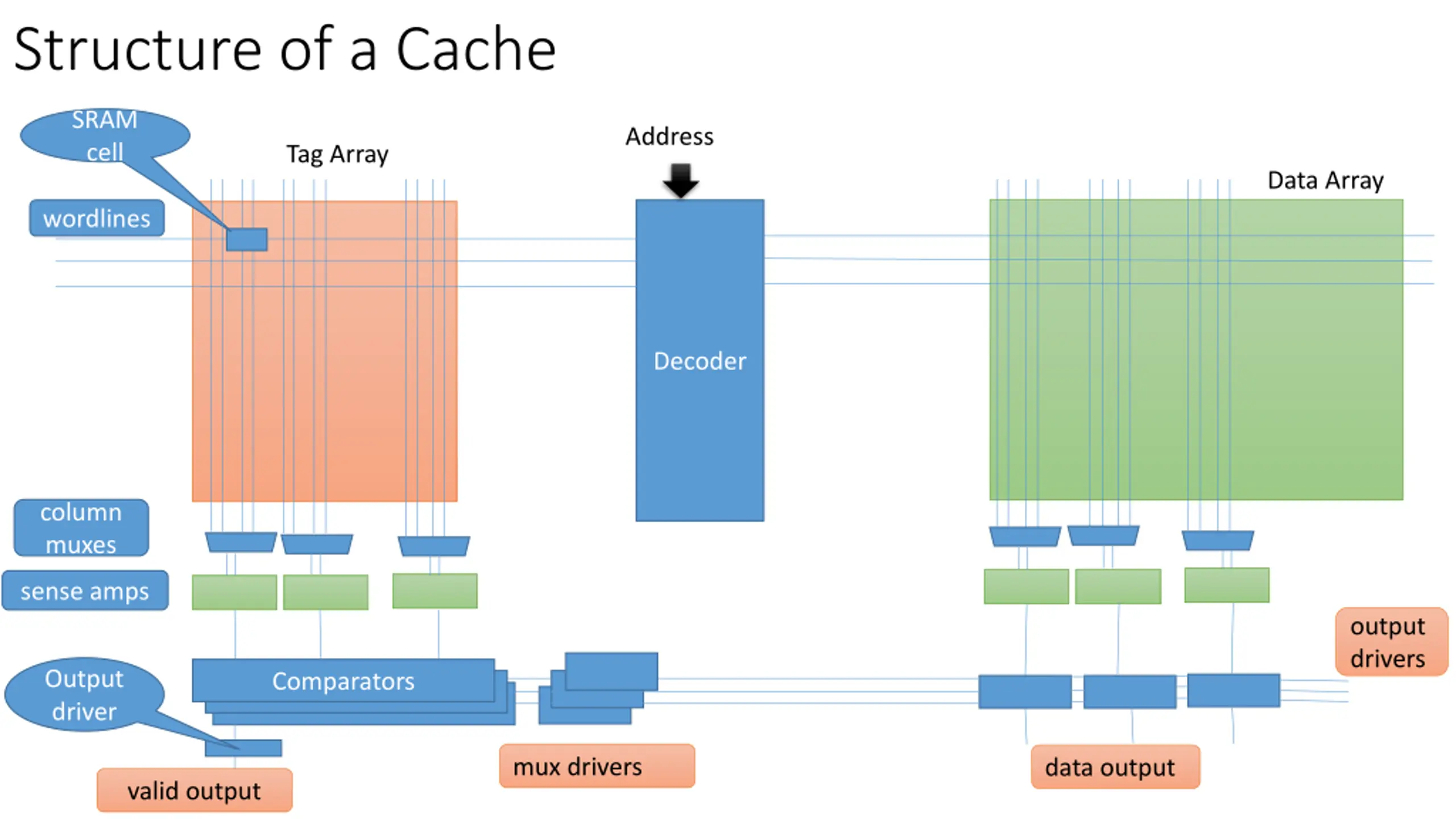 Structure of a Cache SRAM cell Address Tag Array Data Array wordlines Decoder column muxes sense amps output drivers Output driver Comparators mux drivers data output valid output