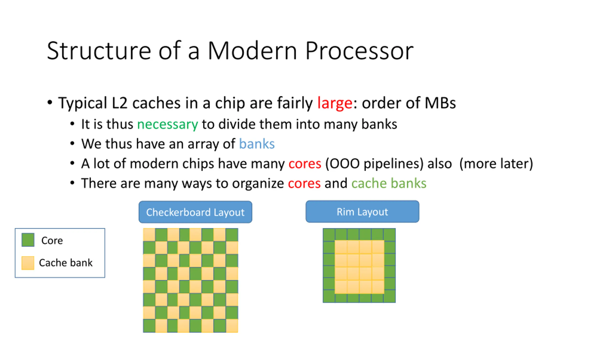 Structure of a Modern Processor Typical L2 caches in a chip are fairly large: order of MBs It is thus necessary to divide them into many banks We thus have an array of banks A lot of modern chips have many cores (OOO pipelines) also (more later) There are many ways to organize cores and cache banks Rim Layout Checkerboard Layout Core Cache bank