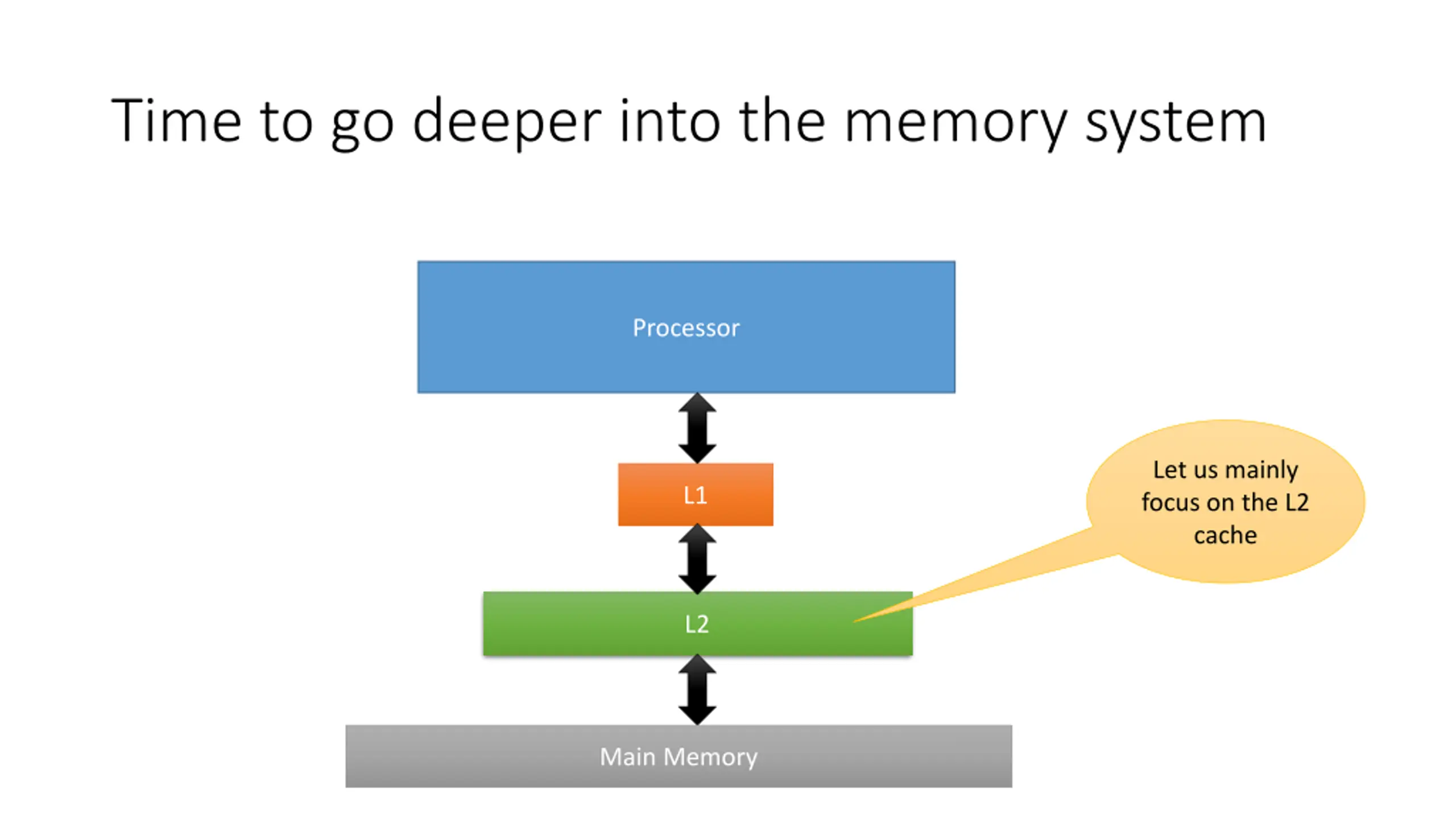 Time to go deeper into the memory system Processor Let us mainly focus on the L2 cache L1 L2 Main Memory