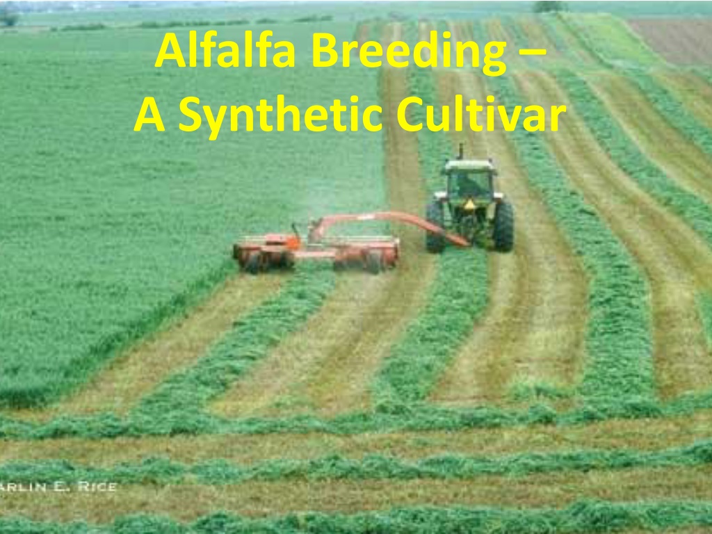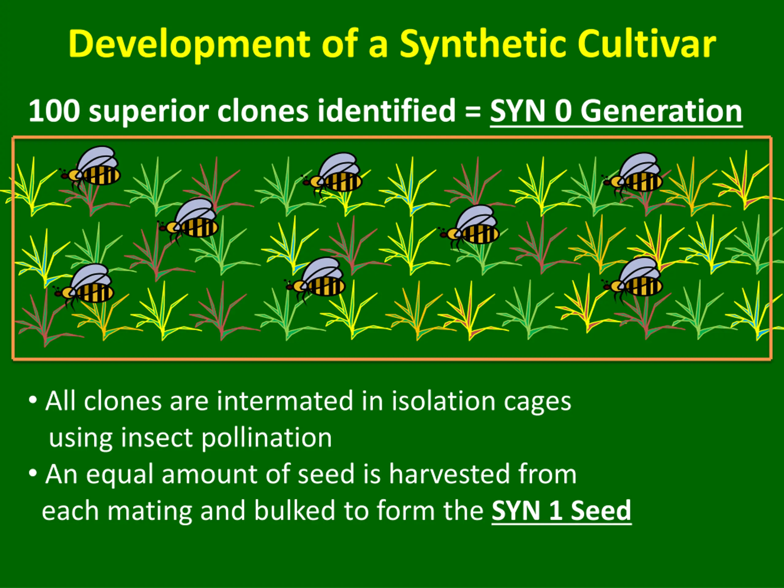 Development of a Synthetic Cultivar 100 superior clones identified = SYN 0 Generation All clones are intermated in isolation cages using insect pollination An equal amount of seed is harvested from each mating and bulked to form the SYN 1 Seed