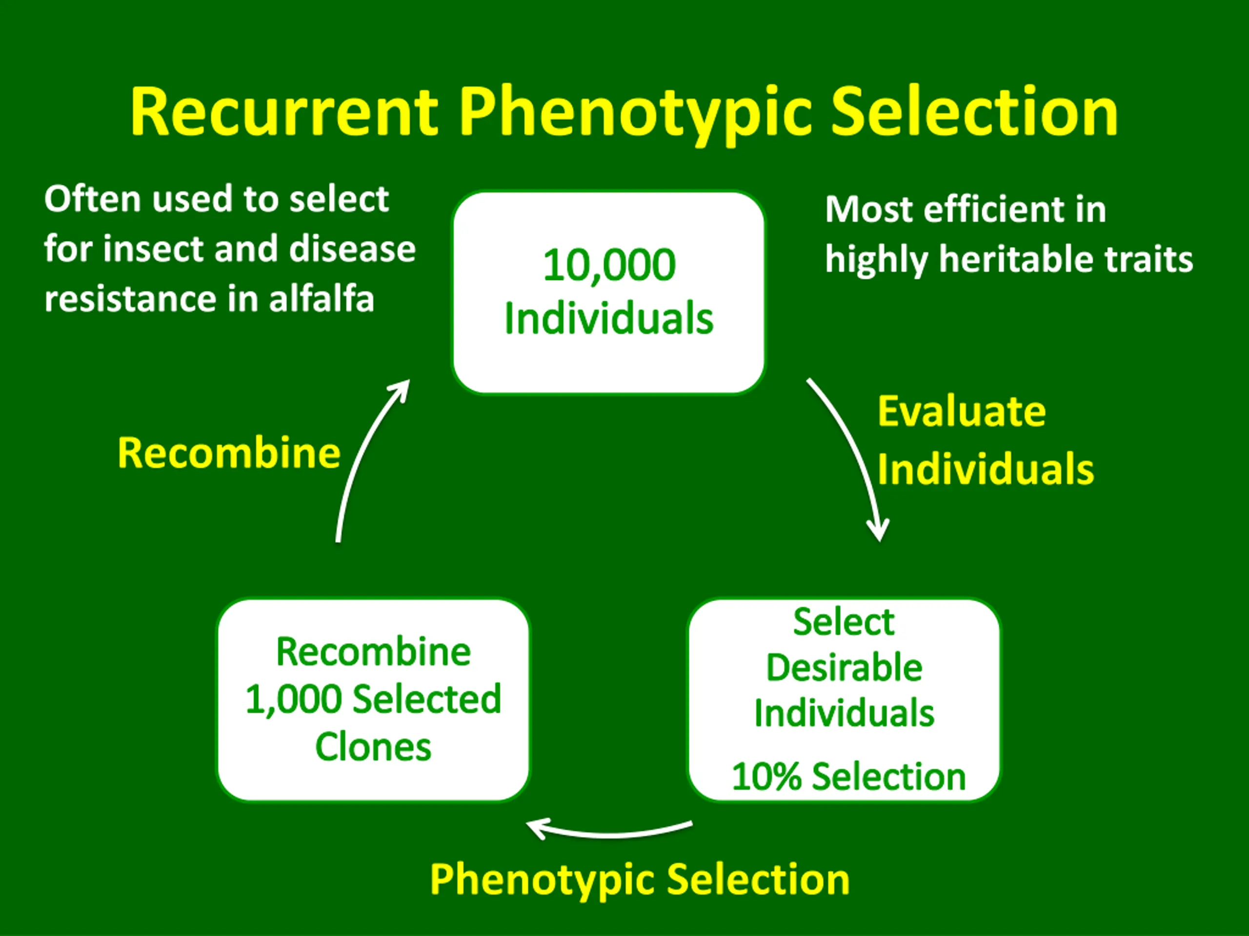 Recurrent Phenotypic Selection Often used to select for insect and disease resistance in alfalfa Most efficient in highly heritable traits 10,000 Individuals Evaluate Individuals Recombine Select Desirable Individuals Recombine 1,000 Selected Clones 10% Selection Phenotypic Selection