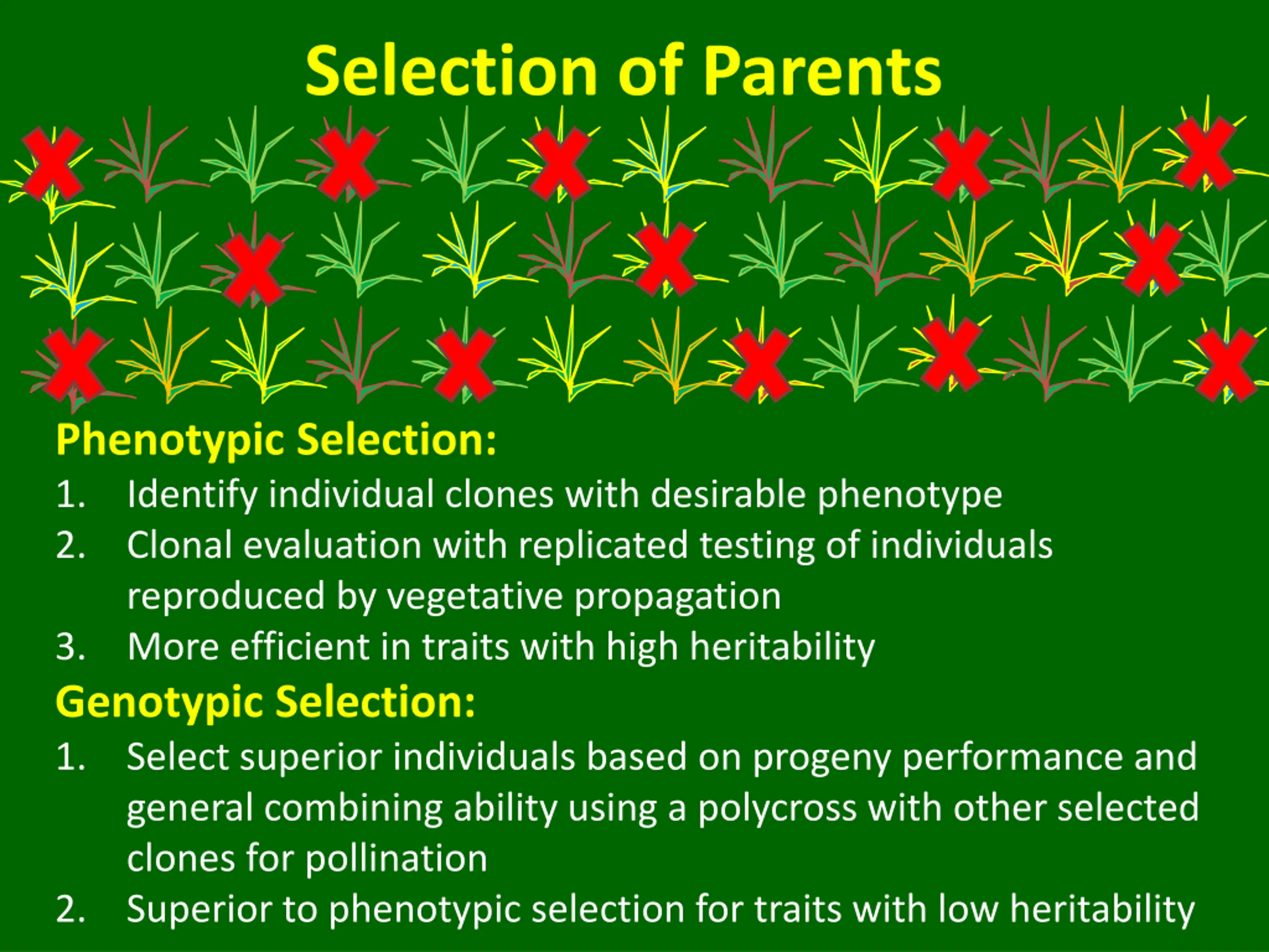 Selection of Parents Phenotypic Selection: 1. Identify individual clones with desirable phenotype 2. Clonal evaluation with replicated testing of individuals reproduced by vegetative propagation 3. More efficient in traits with high heritability Genotypic Selection: 1. Select superior individuals based on progeny performance and general combining ability using a polycross with other selected clones for pollination 2. Superior to phenotypic selection for traits with low heritability