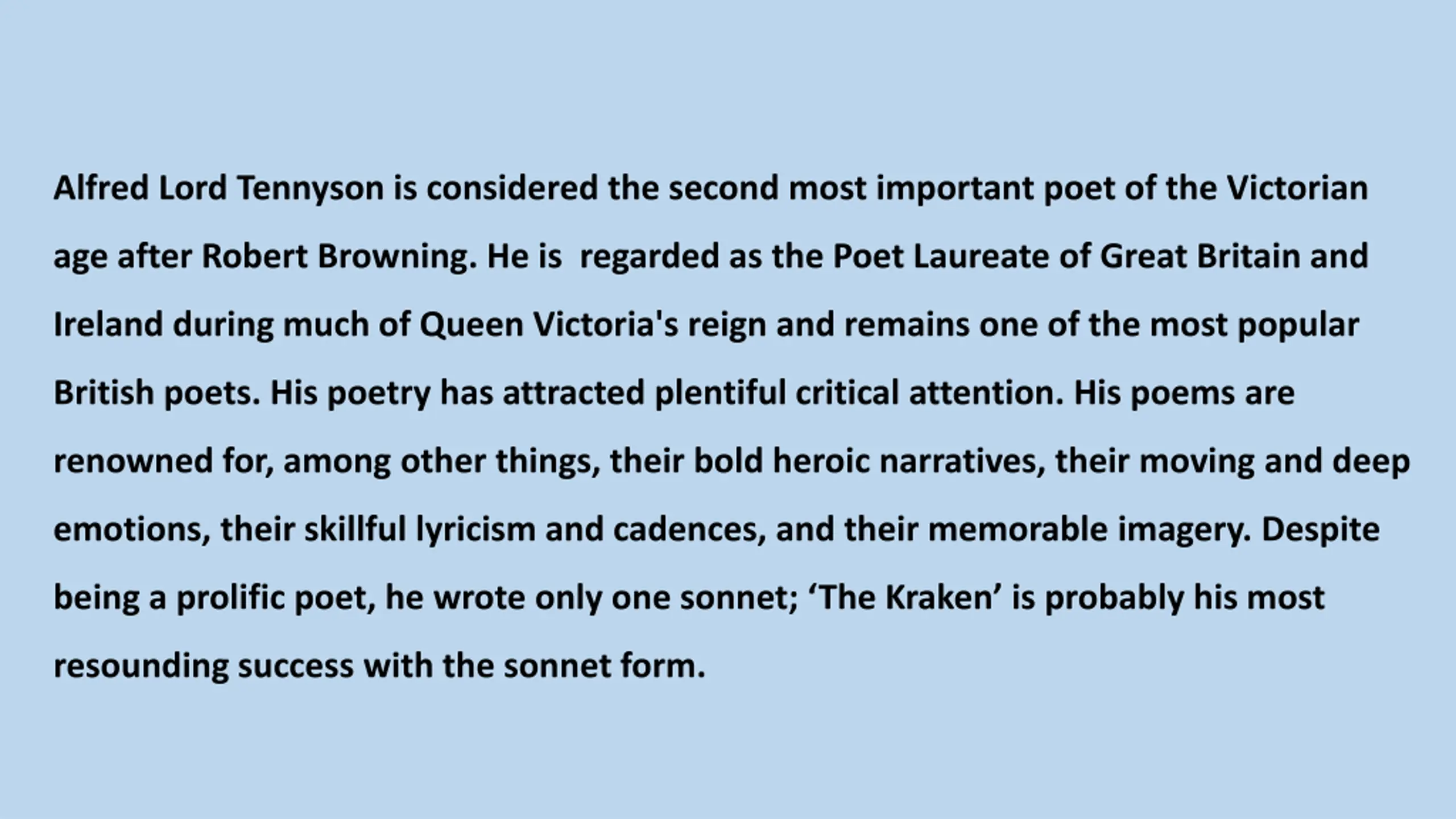 Alfred Lord Tennyson is considered the second most important poet of the Victorian age after Robert Browning. He is regarded as the Poet Laureate of Great Britain and Ireland during much of Queen Victoria's reign and remains one of the most popular British poets. His poetry has attracted plentiful critical attention. His poems are renowned for, among other things, their bold heroic narratives, their moving and deep emotions, their skillful lyricism and cadences, and their memorable imagery. Despite being a prolific poet, he wrote only one sonnet; The Kraken is probably his most resounding success with the sonnet form.