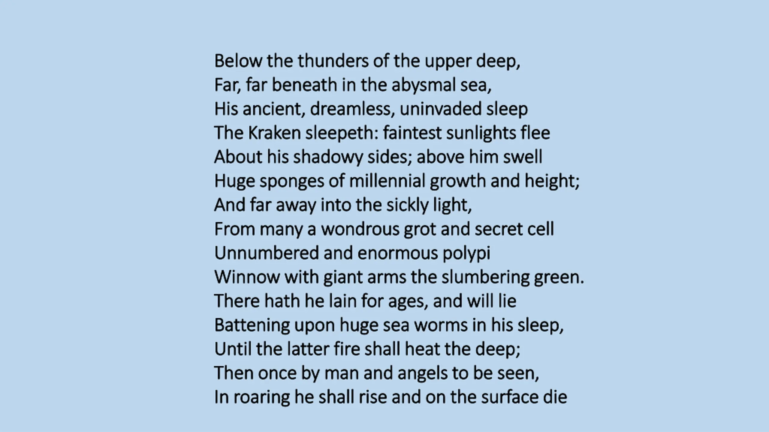 Below the thunders of the upper deep, Below the thunders of the upper deep, Far, far beneath in the abysmal sea, Far, far beneath in the abysmal sea, His ancient, dreamless, uninvaded sleep His ancient, dreamless, uninvaded sleep The Kraken sleepeth: faintest sunlights flee The Kraken sleepeth: faintest sunlights flee About his shadowy sides; above him swell About his shadowy sides; above him swell Huge sponges of millennial growth and height; Huge sponges of millennial growth and height; And far away into the sickly light, And far away into the sickly light, From many a wondrous grot and secret cell From many a wondrous grot and secret cell Unnumbered and enormous polypi Unnumbered and enormous polypi Winnow with giant arms the slumbering green. Winnow with giant arms the slumbering green. There hath he lain for ages, and will lie There hath he lain for ages, and will lie Battening upon huge sea worms in his sleep, Battening upon huge sea worms in his sleep, Until the latter fire shall heat the deep; Until the latter fire shall heat the deep; Then once by man and angels to be seen, Then once by man and angels to be seen, In roaring he shall rise and on the surface die In roaring he shall rise and on the surface die