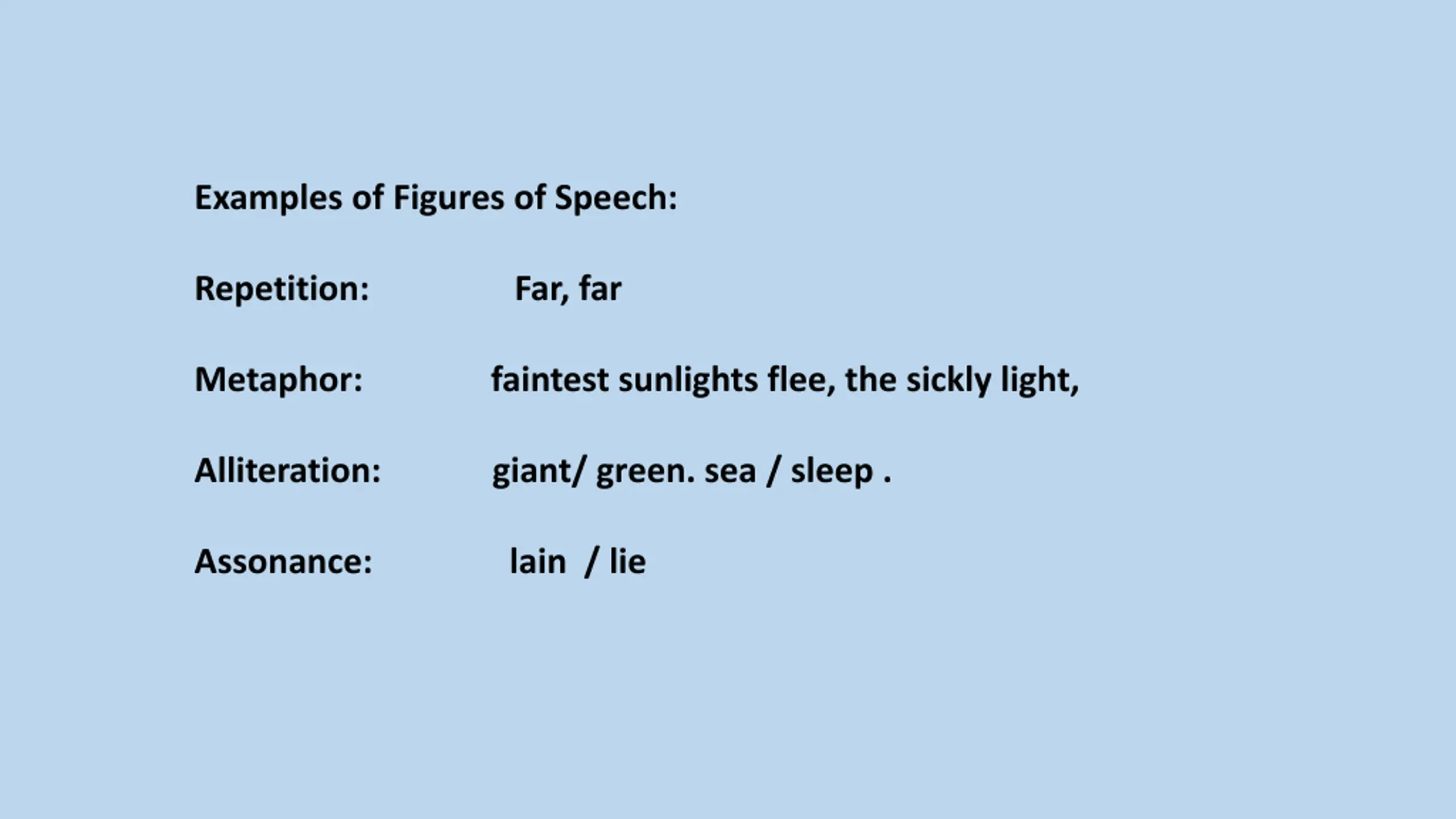 Examples of Figures of Speech: Repetition: Far, far Metaphor: faintest sunlights flee, the sickly light, Alliteration: giant/ green. sea / sleep . Assonance: lain / lie