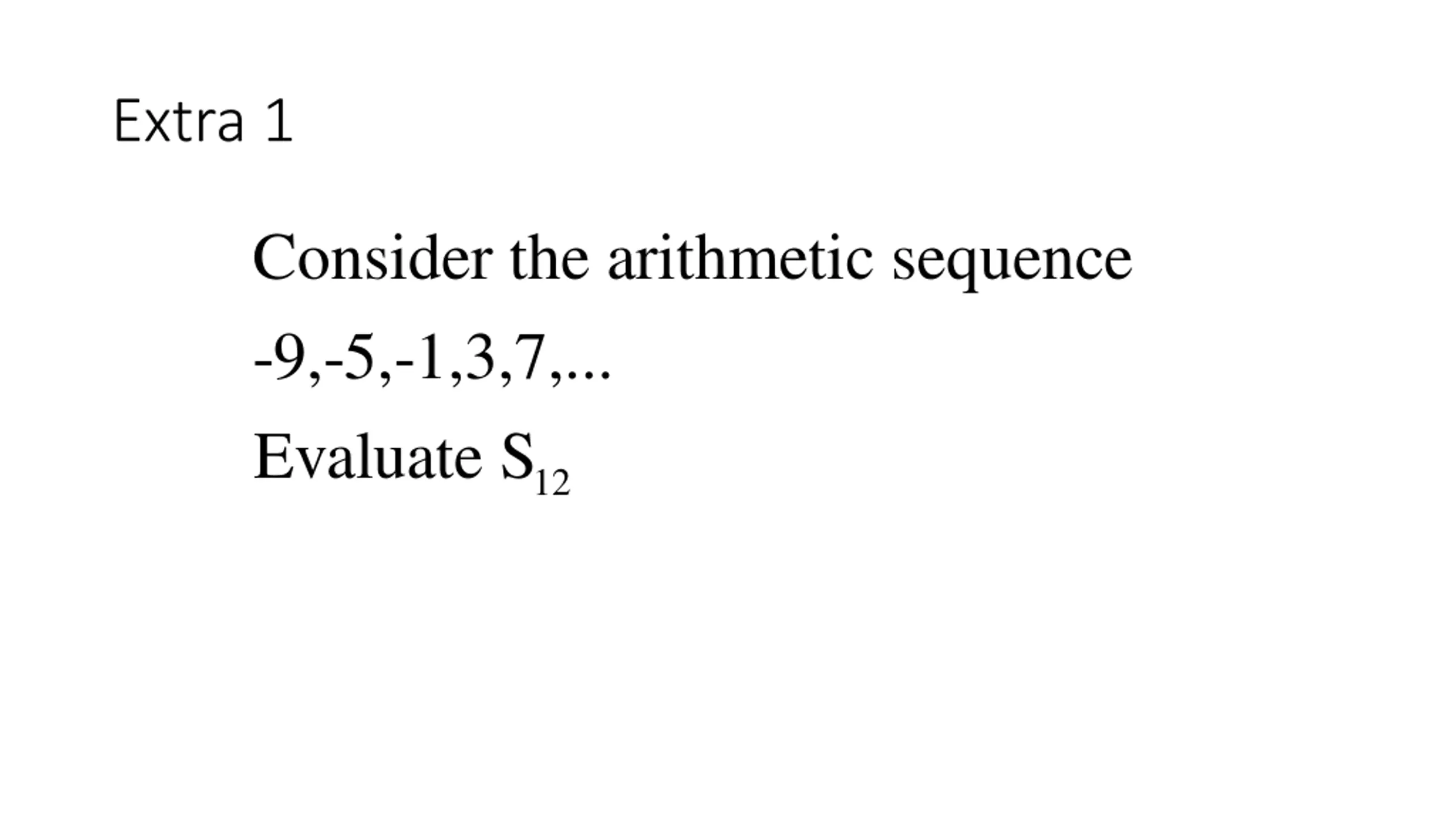 Extra 1 Consider the arithmetic sequence -9,-5,-1,3,7,... Evaluate S 12