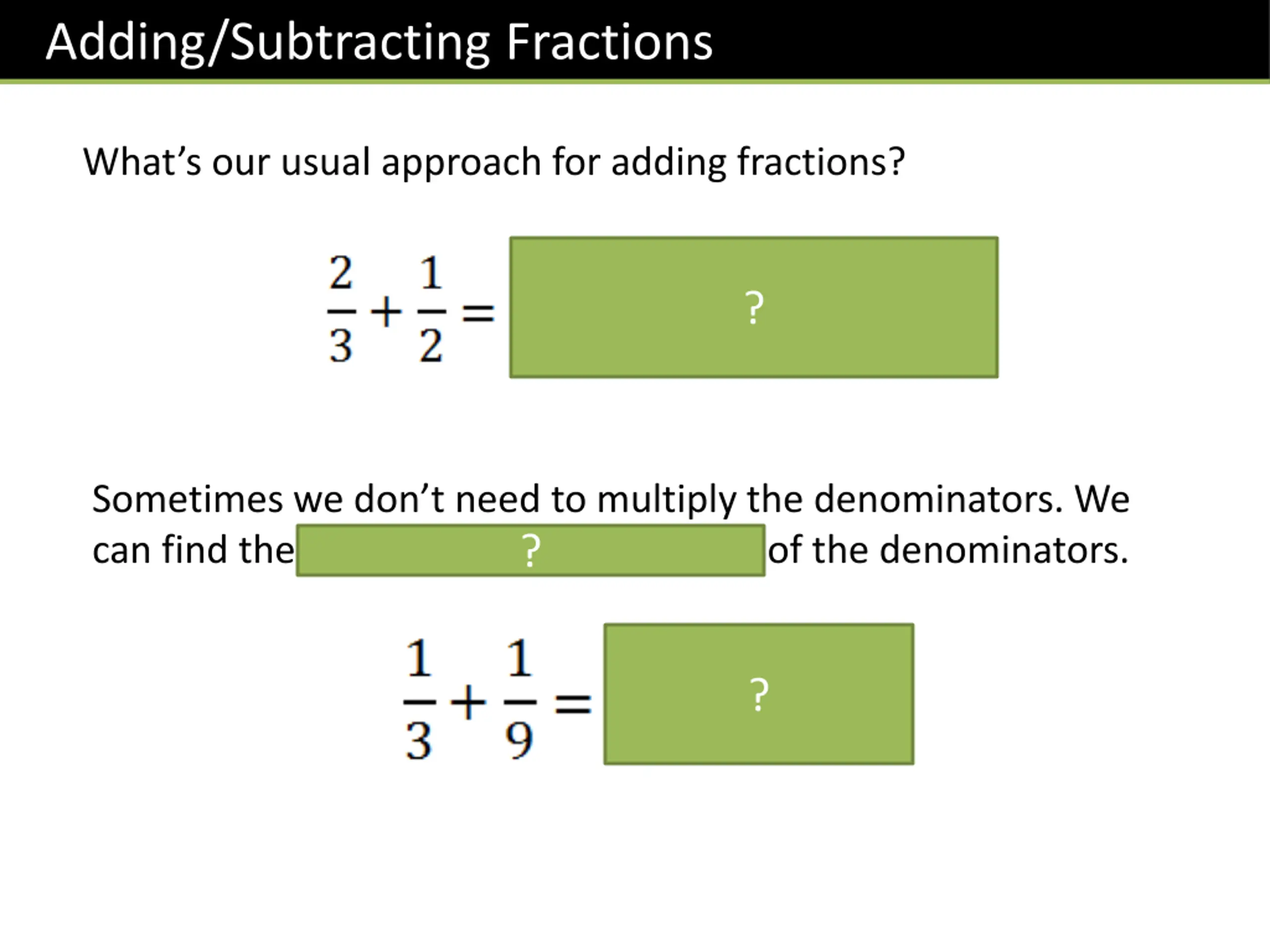 Adding/Subtracting Fractions What s our usual approach for adding fractions? ? Sometimes we don t need to multiply the denominators. We can find the Lowest Common Multiple of the denominators. ? ?