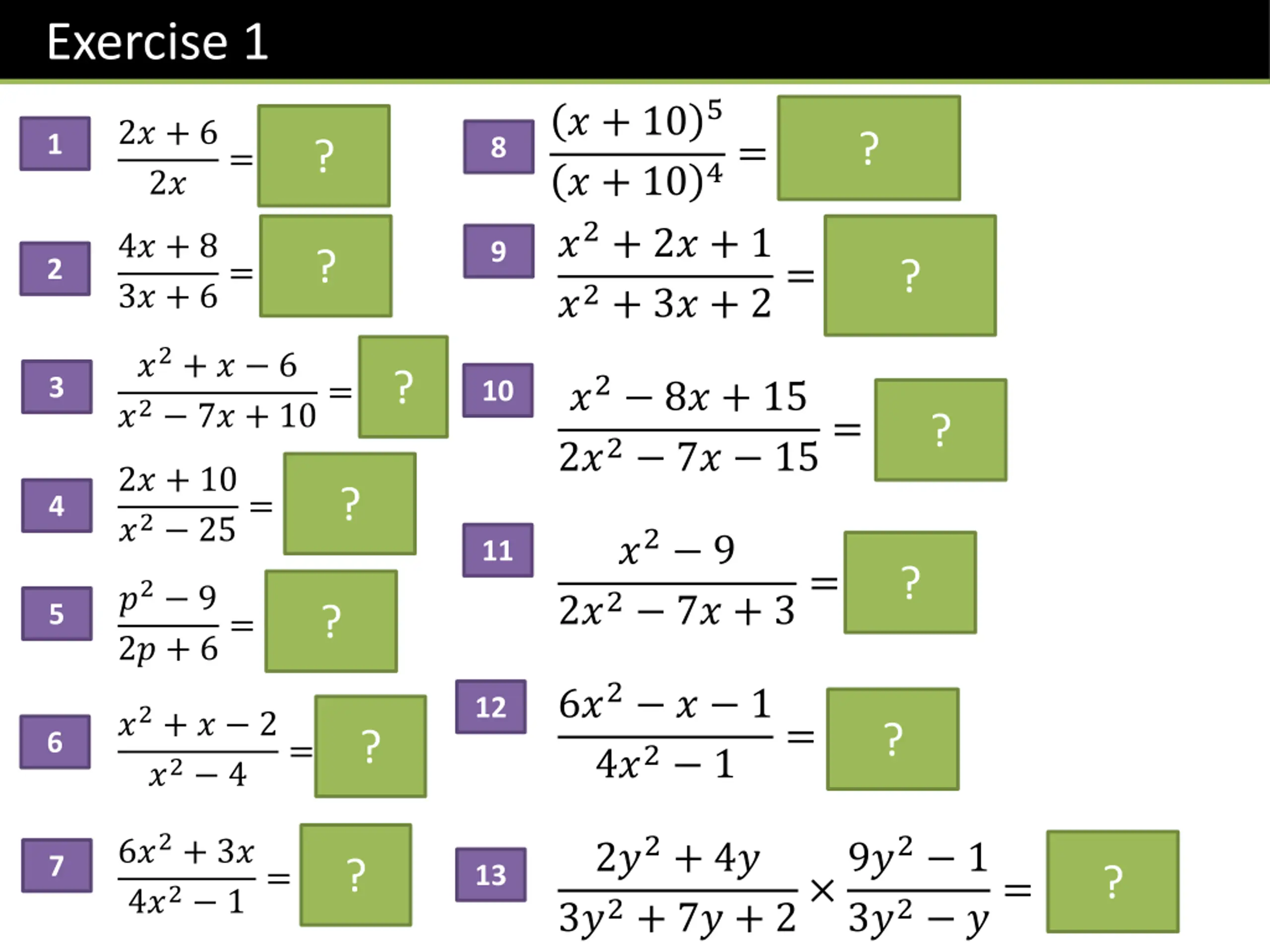 Exercise 1 ? + 105 ? + 104= ? + 10 2? + 6 2? =? + 3 ? 1 8 ? ? ?2+ 2? + 1 ?2+ 3? + 2=? + 1 4? + 8 3? + 6=4 9 ? ? 2 3 ? + 2 ?2+ ? 6 ?2 7? + 10=? + 3 ? 5 ? ?2 8? + 15 2?2 7? 15= 3 10 ? 3 2? + 3 ? 2? + 10 ?2 25= 2 ? 4 ? 5 ?2 9 ? + 3 2? 1 ? 11 2?2 7? + 3= ?2 9 2? + 6=? 3 5 ? 2 6?2 ? 1 4?2 1 =3? + 1 2? + 1 12 ?2+ ? 2 ?2 4 =? 1 ? 2 ? ? 6 6?2+ 3? 4?2 1= 2?2+ 4? 3?2+ 7? + 2 9?2 1 3? ? 7 ? 13 3?2 ?= 2 2? 1