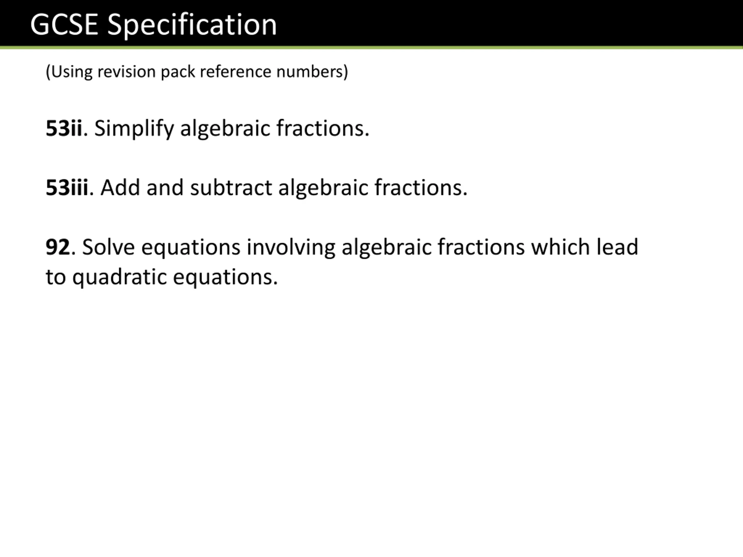 GCSE Specification (Using revision pack reference numbers) 53ii. Simplify algebraic fractions. 53iii. Add and subtract algebraic fractions. 92. Solve equations involving algebraic fractions which lead to quadratic equations.