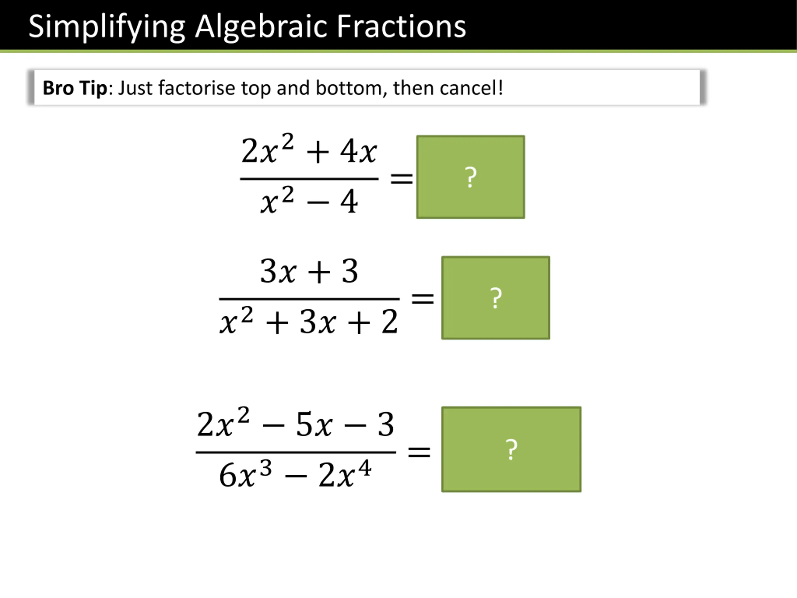 Simplifying Algebraic Fractions Bro Tip: Just factorise top and bottom, then cancel! 2?2+ 4? ?2 4 2? ? = ? 2 3? + 3 ?2+ 3? + 2= 3 ? ? + 2 2?2 5? 3 6?3 2?4 = 2? + 1 ? 2?3