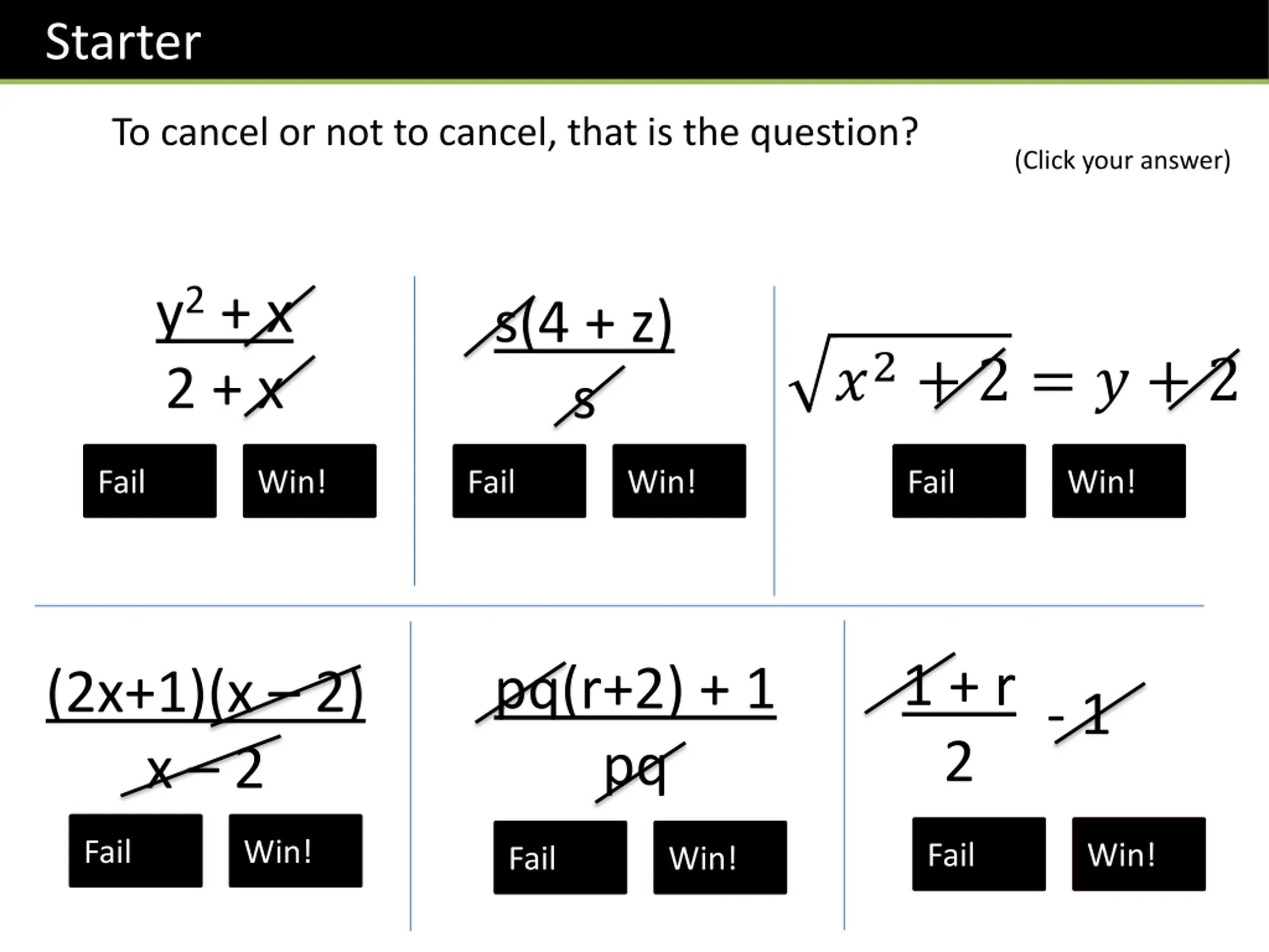 Starter To cancel or not to cancel, that is the question? (Click your answer) y2 + x 2 + x s(4 + z) s Fail ?2+ 2 = ? + 2 Fail Win! Win! Fail Win! 1 + r 2 pq(r+2) + 1 pq (2x+1)(x 2) x 2 Fail - 1 Win! Fail Win! Fail Win!