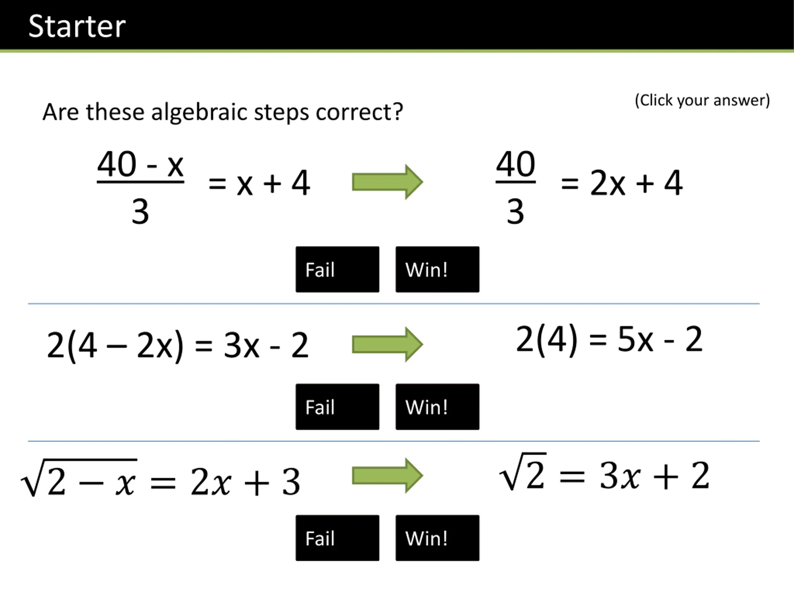 Starter (Click your answer) Are these algebraic steps correct? 40 - x 3 40 3 = x + 4 = 2x + 4 Fail Win! 2(4) = 5x - 2 2(4 2x) = 3x - 2 Fail Win! 2 = 3? + 2 2 ? = 2? + 3 Fail Win!