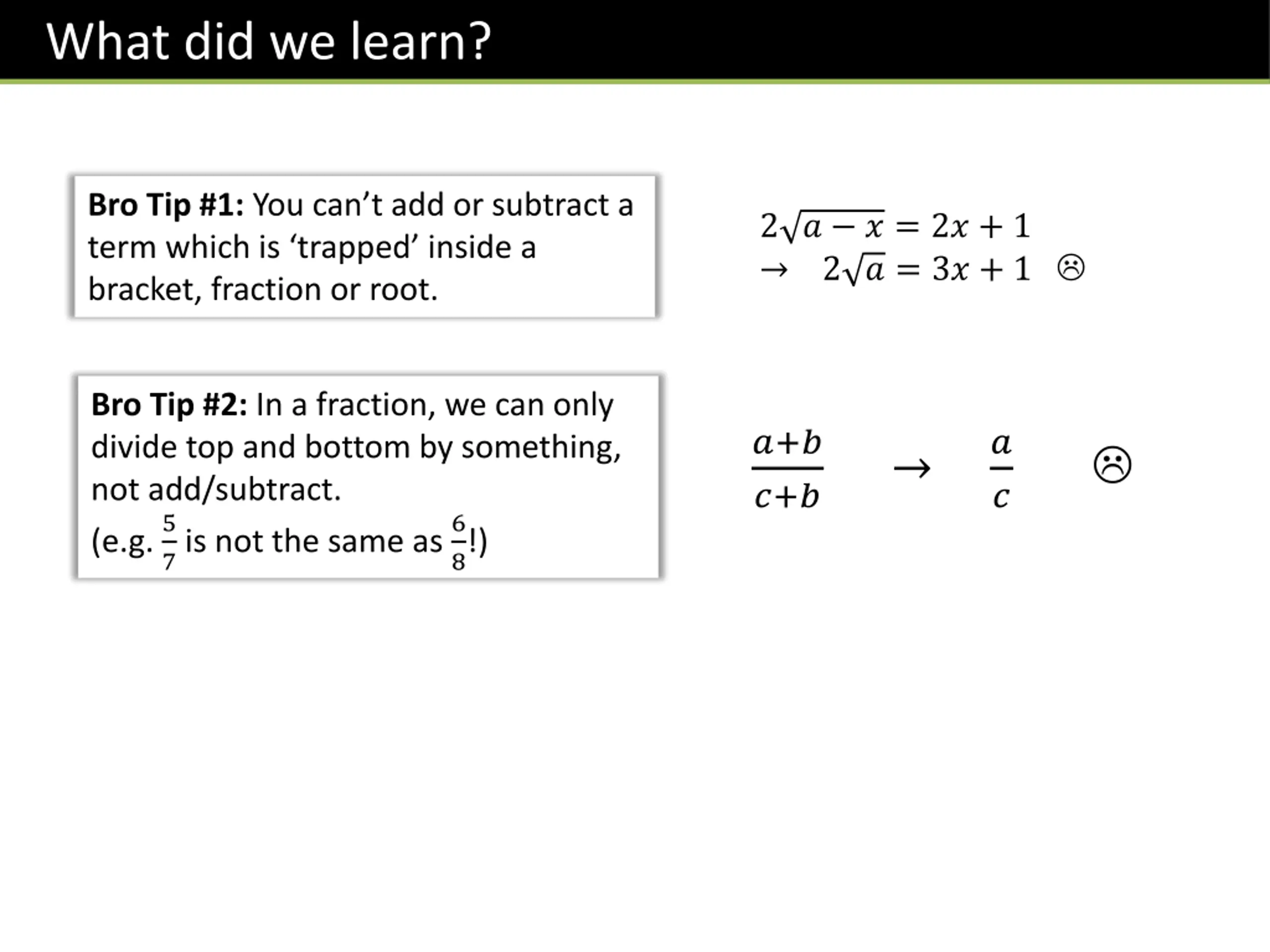 What did we learn? Bro Tip #1: You can t add or subtract a term which is trapped inside a bracket, fraction or root. 2 ? ? = 2? + 1 2 ? = 3? + 1 Bro Tip #2: In a fraction, we can only divide top and bottom by something, not add/subtract. (e.g. 5 ?+? ?+? ? ? 7 is not the same as 6 8!)