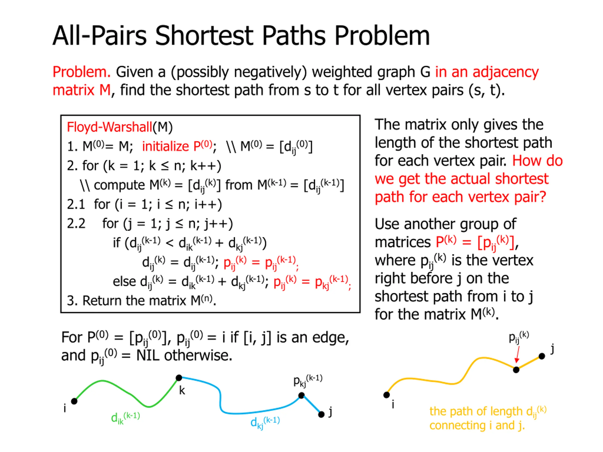 All-Pairs Shortest Paths Problem Problem. Given a (possibly negatively) weighted graph G in an adjacency matrix M, find the shortest path from s to t for all vertex pairs (s, t). The matrix only gives the length of the shortest path for each vertex pair. How do we get the actual shortest path for each vertex pair? Floyd-Warshall(M) 1. M(0)= M; \\ M(0) = [dij(0)] 2. for (k = 1; k n; k++) \\ compute M(k) = [dij(k)] from M(k-1) = [dij(k-1)] 2.1 for (i = 1; i n; i++) 2.2 for (j = 1; j n; j++) if (dij(k-1) < dik(k-1) + dkj(k-1)) dij(k) = dij(k-1); else dij(k) = dik(k-1) + dkj(k-1); 3. return the matrix M(n). Use another group of matrices P(k) = [pij(k)], where pij(k) is the vertex right before j on the shortest path from i to j for the matrix M(k). pij(k) j i the path of length dij(k) connecting i and j.