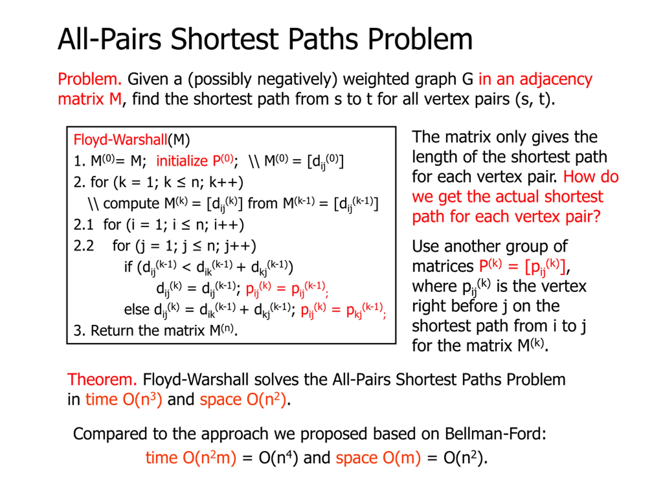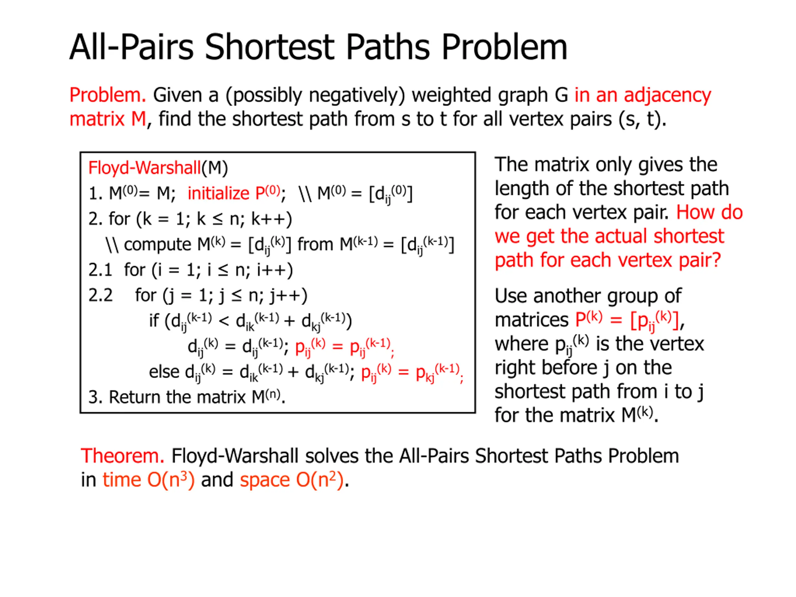 All-Pairs Shortest Paths Problem Problem. Given a (possibly negatively) weighted graph G in an adjacency matrix M, find the shortest path from s to t for all vertex pairs (s, t). The matrix only gives the length of the shortest path for each vertex pair. How do we get the actual shortest path for each vertex pair? Floyd-Warshall(M) 1. M(0)= M; initialize P(0); \\ M(0) = [dij(0)] 2. for (k = 1; k n; k++) \\ compute M(k) = [dij(k)] from M(k-1) = [dij(k-1)] 2.1 for (i = 1; i n; i++) 2.2 for (j = 1; j n; j++) if (dij(k-1) < dik(k-1) + dkj(k-1)) dij(k) = dij(k-1); pij(k) = pij(k-1); else dij(k) = dik(k-1) + dkj(k-1); pij(k) = pkj(k-1); 3. Return the matrix M(n). Use another group of matrices P(k) = [pij(k)], where pij(k) is the vertex right before j on the shortest path from i to j for the matrix M(k). Theorem. Floyd-Warshall solves the All-Pairs Shortest Paths Problem in time O(n3) and space O(n2).