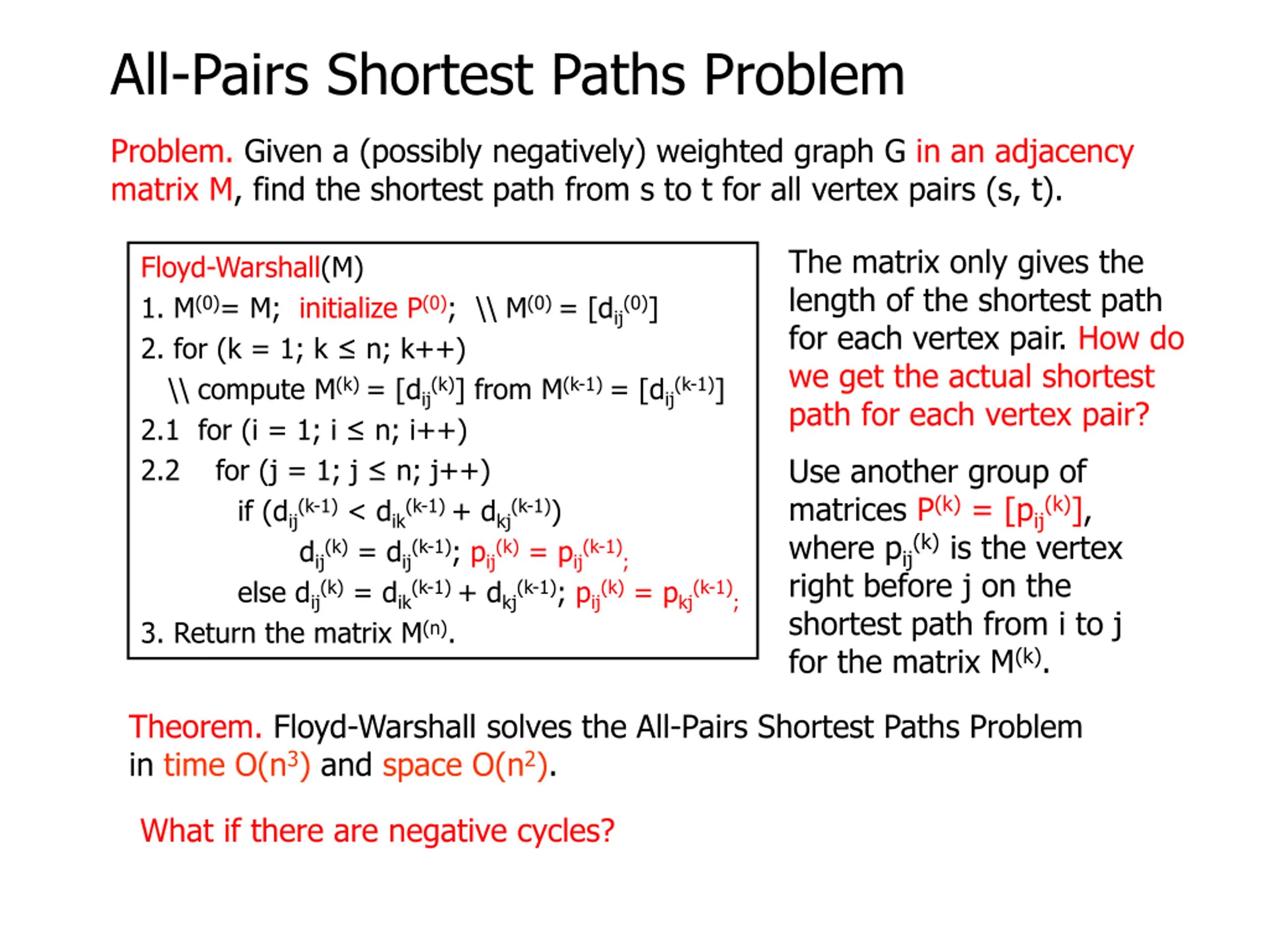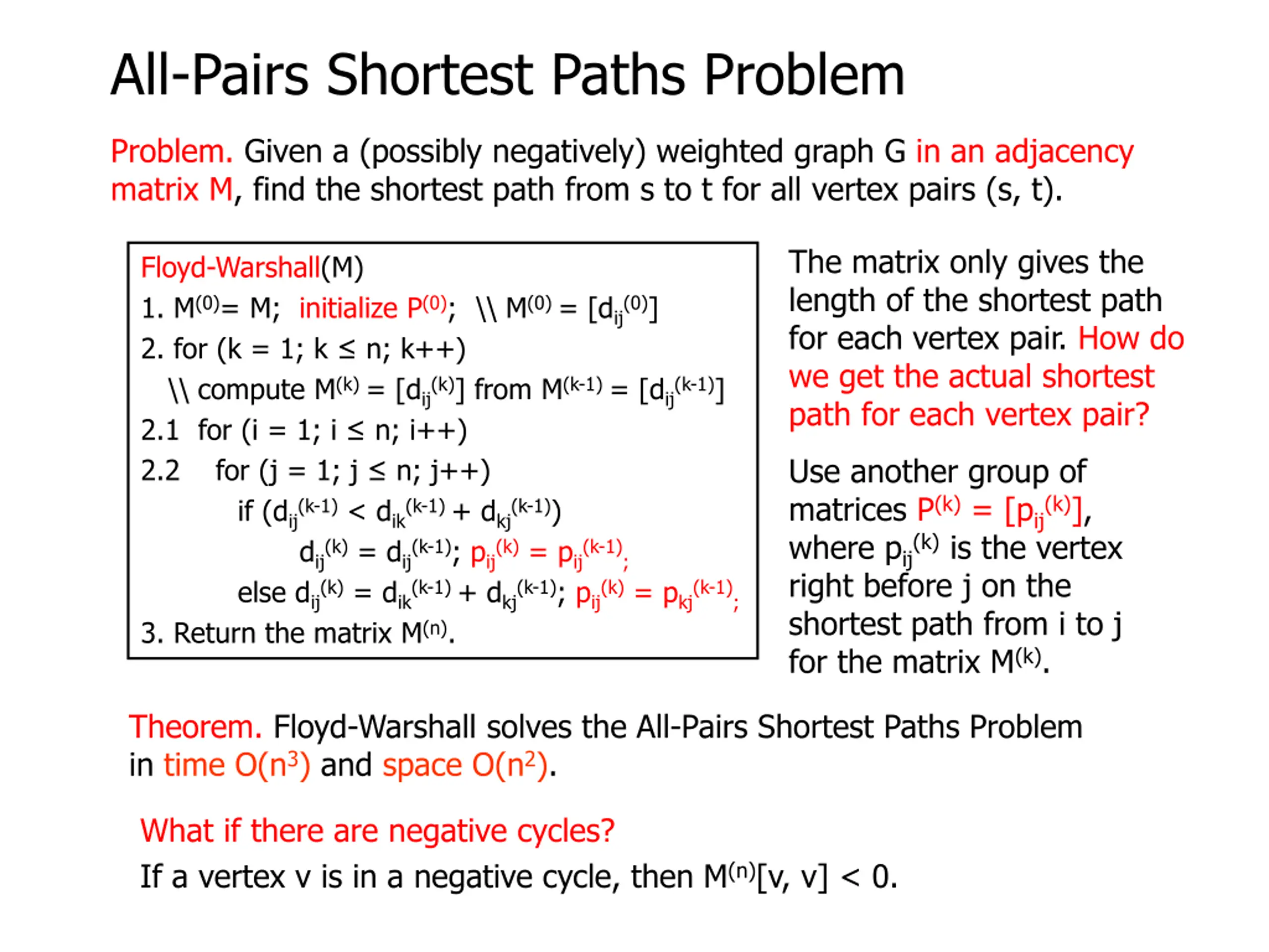 All-Pairs Shortest Paths Problem Problem. Given a (possibly negatively) weighted graph G in an adjacency matrix M, find the shortest path from s to t for all vertex pairs (s, t). The matrix only gives the length of the shortest path for each vertex pair. How do we get the actual shortest path for each vertex pair? Floyd-Warshall(M) 1. M(0)= M; initialize P(0); \\ M(0) = [dij(0)] 2. for (k = 1; k n; k++) \\ compute M(k) = [dij(k)] from M(k-1) = [dij(k-1)] 2.1 for (i = 1; i n; i++) 2.2 for (j = 1; j n; j++) if (dij(k-1) < dik(k-1) + dkj(k-1)) dij(k) = dij(k-1); pij(k) = pij(k-1); else dij(k) = dik(k-1) + dkj(k-1); pij(k) = pkj(k-1); 3. Return the matrix M(n). Use another group of matrices P(k) = [pij(k)], where pij(k) is the vertex right before j on the shortest path from i to j for the matrix M(k). Theorem. Floyd-Warshall solves the All-Pairs Shortest Paths Problem in time O(n3) and space O(n2). What if there are negative cycles?