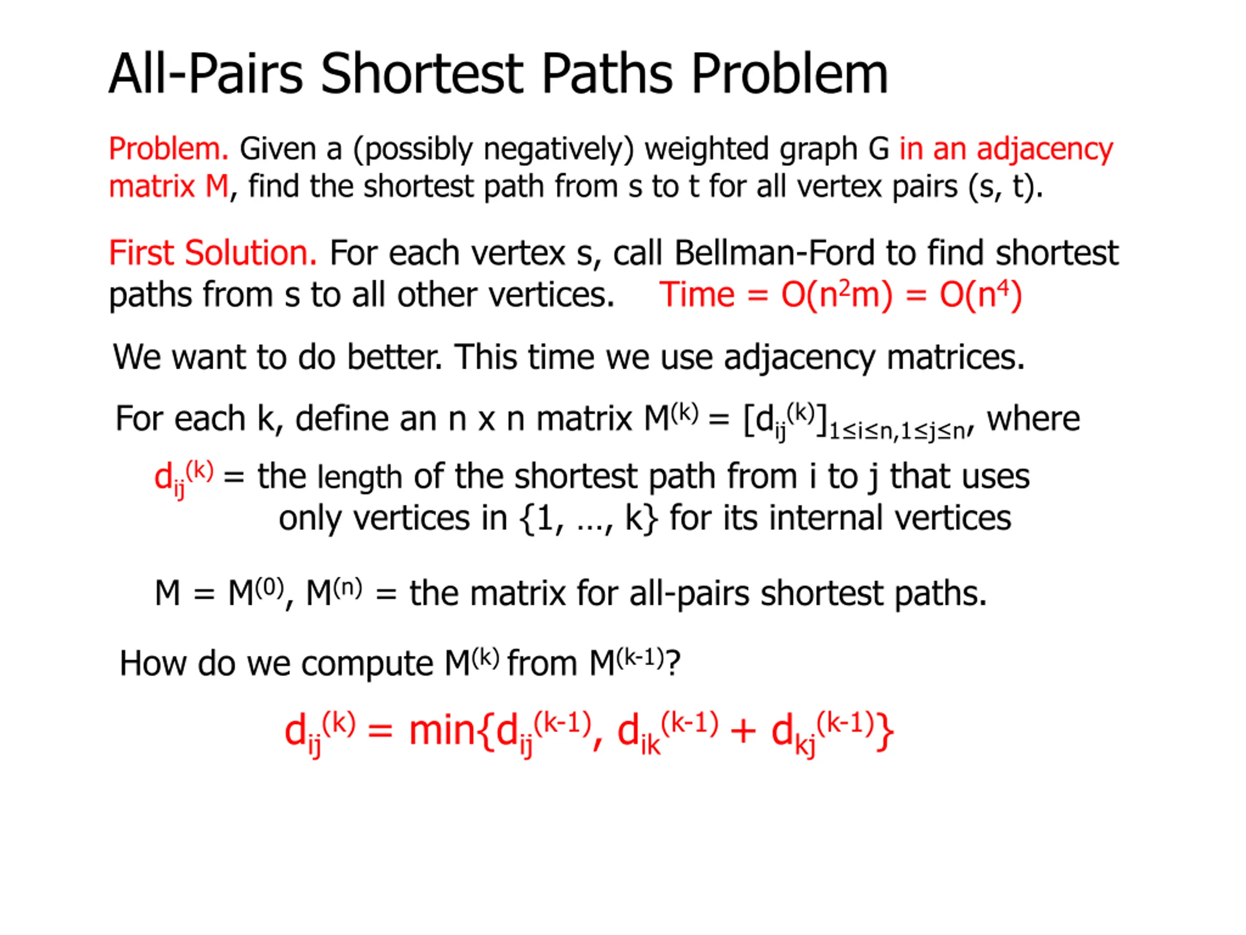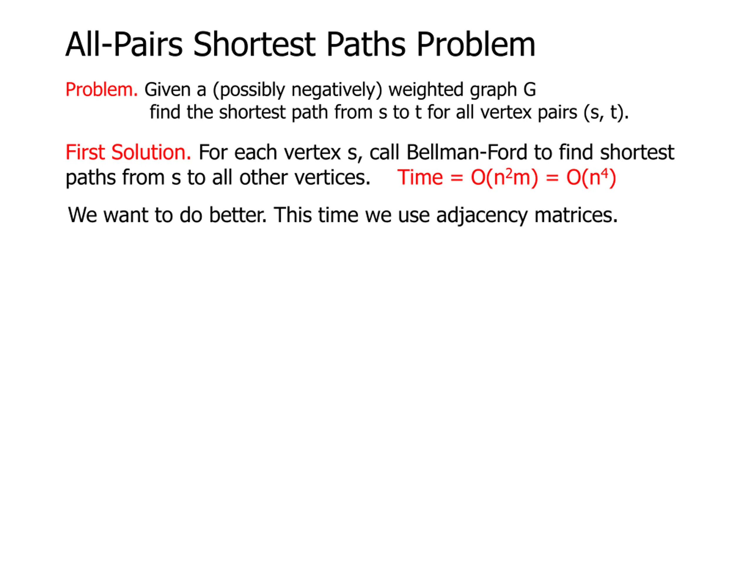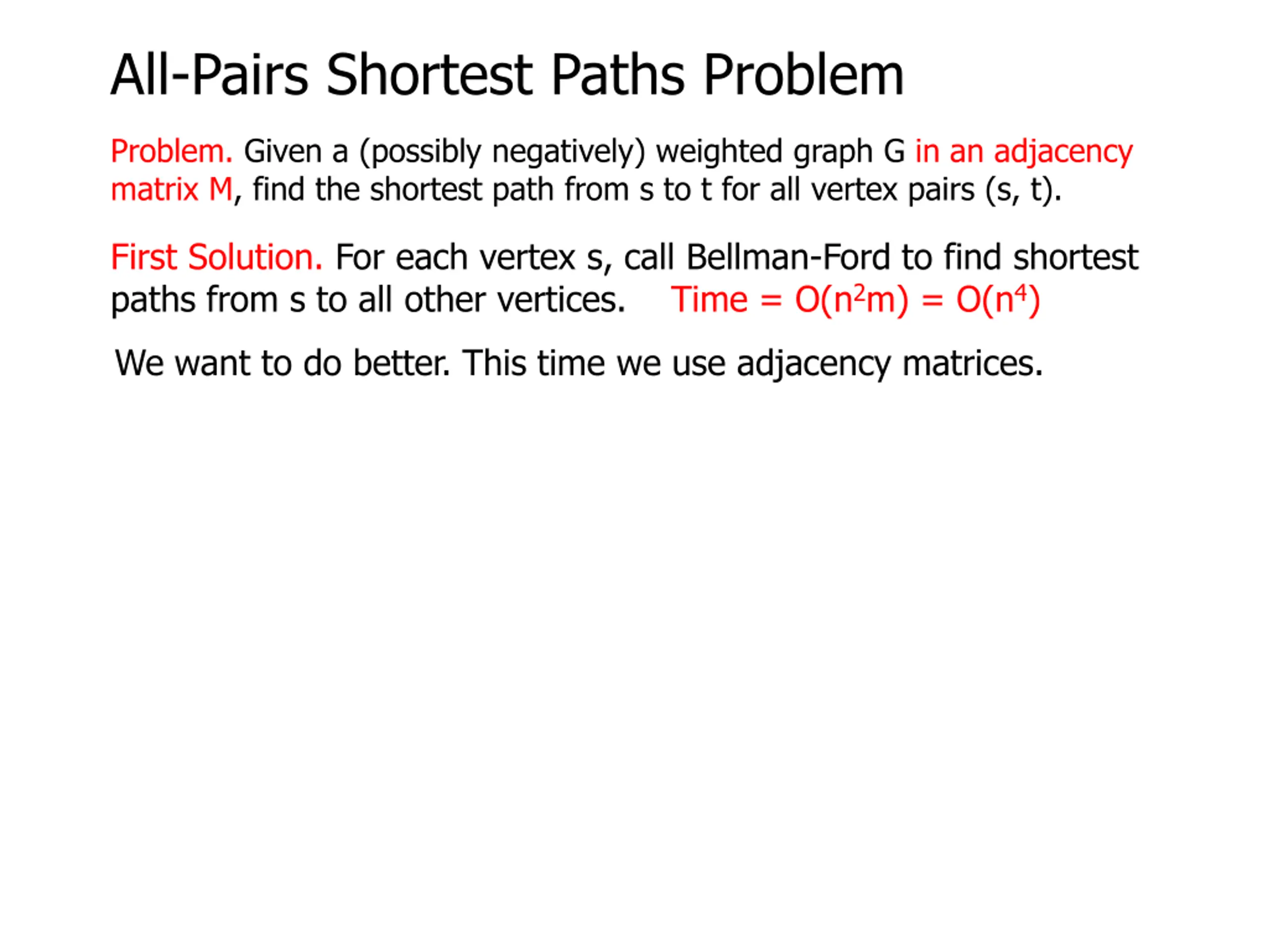 All-Pairs Shortest Paths Problem Problem. Given a (possibly negatively) weighted graph G in an adjacency matrix M, find the shortest path from s to t for all vertex pairs (s, t). First Solution. For each vertex s, call Bellman-Ford to find shortest paths from s to all other vertices. Time = O(n2m) = O(n4)