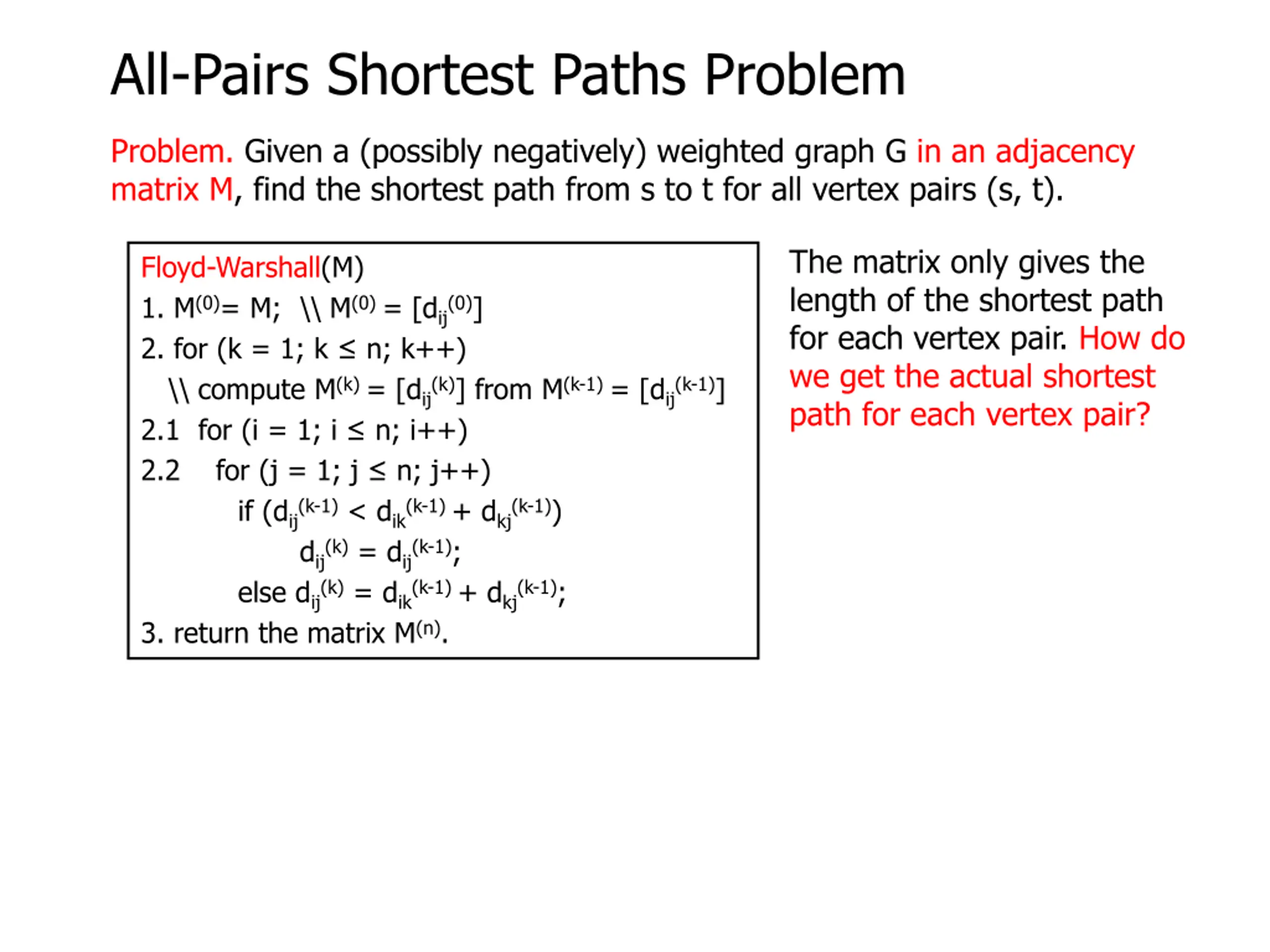 All-Pairs Shortest Paths Problem Problem. Given a (possibly negatively) weighted graph G in an adjacency matrix M, find the shortest path from s to t for all vertex pairs (s, t). The matrix only gives the length of the shortest path for each vertex pair. How do we get the actual shortest path for each vertex pair? Floyd-Warshall(M) 1. M(0)= M; \\ M(0) = [dij(0)] 2. for (k = 1; k n; k++) \\ compute M(k) = [dij(k)] from M(k-1) = [dij(k-1)] 2.1 for (i = 1; i n; i++) 2.2 for (j = 1; j n; j++) if (dij(k-1) < dik(k-1) + dkj(k-1)) dij(k) = dij(k-1); else dij(k) = dik(k-1) + dkj(k-1); 3. return the matrix M(n).